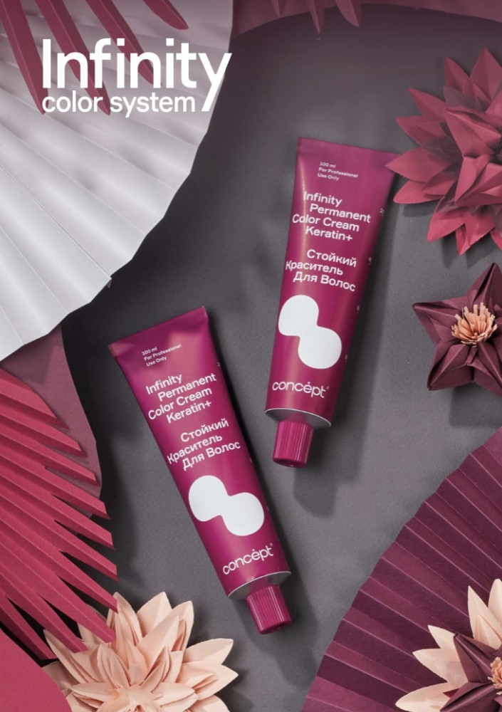 Стойкий краситель для волос Concept Infinity Permanent Color Cream Keratin+ — краситель, вдохновляющий создавать шедевры: 112 невероятно красивых оттенков. 9 новых направлений в палитре. Краситель, восстанавливающий структуру волос: синергия аммиачного компонента и аминоспиртов в формуле позволяют создавать стойкие интенсивные оттенки, уменьшая нагрузку на структуру волоса. Комплекс Keratin Infusion+ Shea butter эффективно застраивает пустоты в кортексе, не только возвращая волосу натуральную структуру, но и надежно фиксируя пигмент, питает и увлажняет волосы, обеспечивая силу и блеск. Это одновременное окрашивание и восстановление, возможное благодаря совместному действию кератина и масла ши, входящим в состав стойкого красителя.