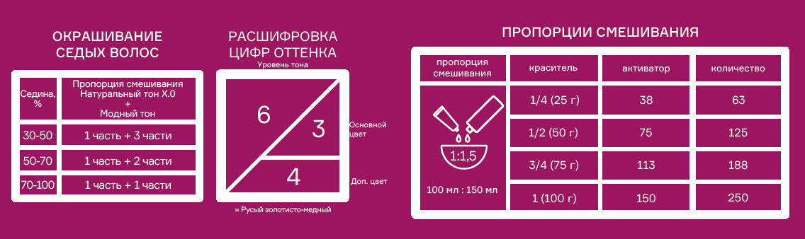 1. Для окрашивания «тон в тон» применяется 3% или 6% окислитель. Пропорция смешивания 1:1,5. Время выдержки 30-40 минут.