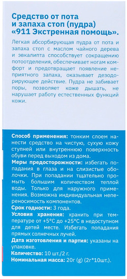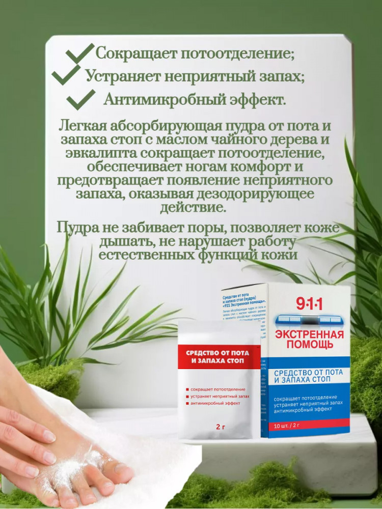 💳 Оплатить за товар можно при получении 🇰🇿 Есть бесплатная доставка по Казахстану от 1 дня 🎁 Копите бонусы с каждой покупки Серия: 911 Экстренная помощь Легкая абсорбирующая пудра от пота и запаха стоп с маслом чайного дерева и эвкалипта способствует сокращению потоотделения, обеспечивает ногам комфорт и предотвращает появление неприятного запаха, оказывает дезодорирующее действие. Пудра не забивает поры, позволяет коже дышать, не нарушает работу естественных функций кожи. |