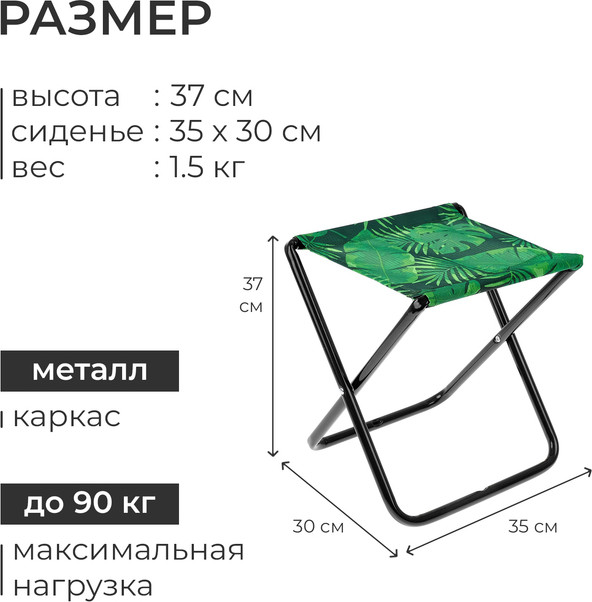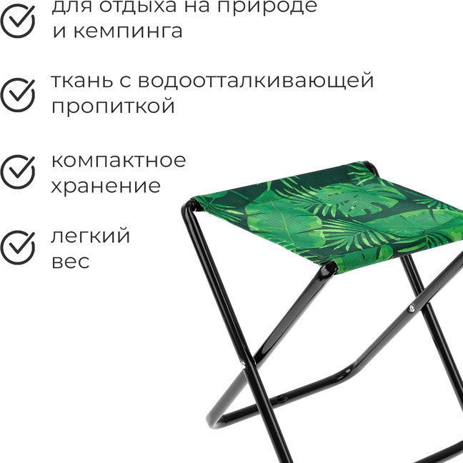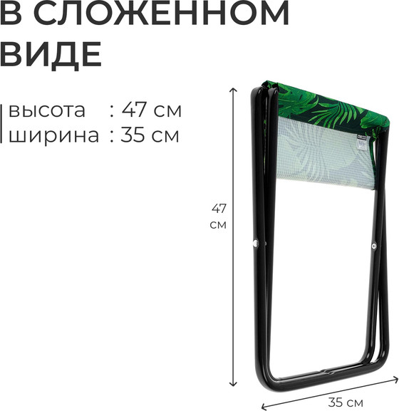 Стул отлично подойдёт для отдыха на открытом воздухе или и в помещении. Отличительной особенностью является его компактность — оно складывается и не займёт много места. Материал: каркас — металлическая труба; чехол — ткань с водоотталкивающей пропиткой. Ткань не боится воды, легко чистится моющими средствами и устойчива к загрязнениям.