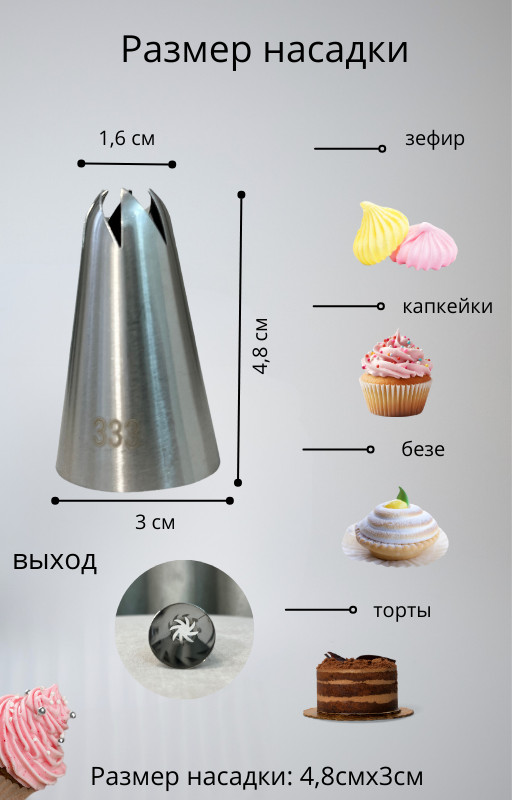Насадка кондитерская №333В данный момент этот товар отсутствует в продаже. Возможно, у нас найдется аналогичный или похожий товар здесь. Кондитерская насадка для крема 333 поможет создать реалистичные цветы, чтобы дополнить все ваши кондитерские шедевры. Насадка 333 идеально подходит для больших цветов из крема, а также для зефирных цветов. Её можно использовать для создания отдельных цветочных лепестков или формировать разнообразные сахарные цветы любого размера путём наложения листочков друг на друга. Также насадка подойдёт для оформления бордюров, ламбрекенов, рюш и других съедобных декоративных элементов. Изделие выполнено из пищевой нержавеющей стали, не имеет шва. Размеры: диаметр отверстия — 16 мм, диаметр основания — 30 мм, высота — 48 мм. Кондитерские насадки — это практичный подарок для мамы, сестры, подруги или бабушки. Их стоит приобрести как начинающим, так и опытным кондитерам. Перед первым использованием рекомендуется промыть насадку проточной водой с применением моющего средства. После каждого применения следует тщательно промывать изделие и вытирать насухо мягкой тканью. Соблюдение этих правил обеспечит долгий срок службы инструмента. |
