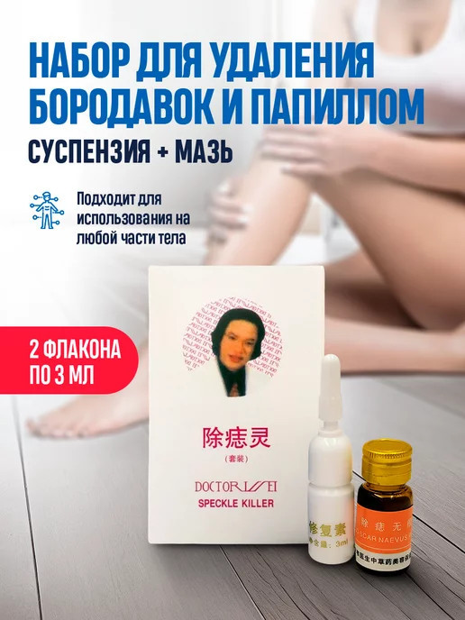 В данный момент этот товар отсутствует в продаже. Возможно, у нас найдется аналогичный или похожий товар здесь. Широко известное и популярное средство для самостоятельного удаления бородавок и папиллом. При внимательном следовании инструкции комплекс обеспечивает полное оздоровление и очищение вашей кожи, а также гарантированно предотвращает повторное появление болезни. Препарат вобрал в себя современные технологии производства и древнюю рецептуру китайской медицины. Средство безопасно для использования и не вызывает аллергических реакций организма. Действие на организм: Набор натуральных средств для эффективного и бесследного удаления папиллом и бородавок. Комплект включает в себя суспензию для устранения образований на коже и мазь для последующего восстановления кожного покрова. Важно: перед применением проконсультируйтесь со специалистом для твердой уверенности, что вы удаляете именно бородавку или папиллому, а не что-то другое.