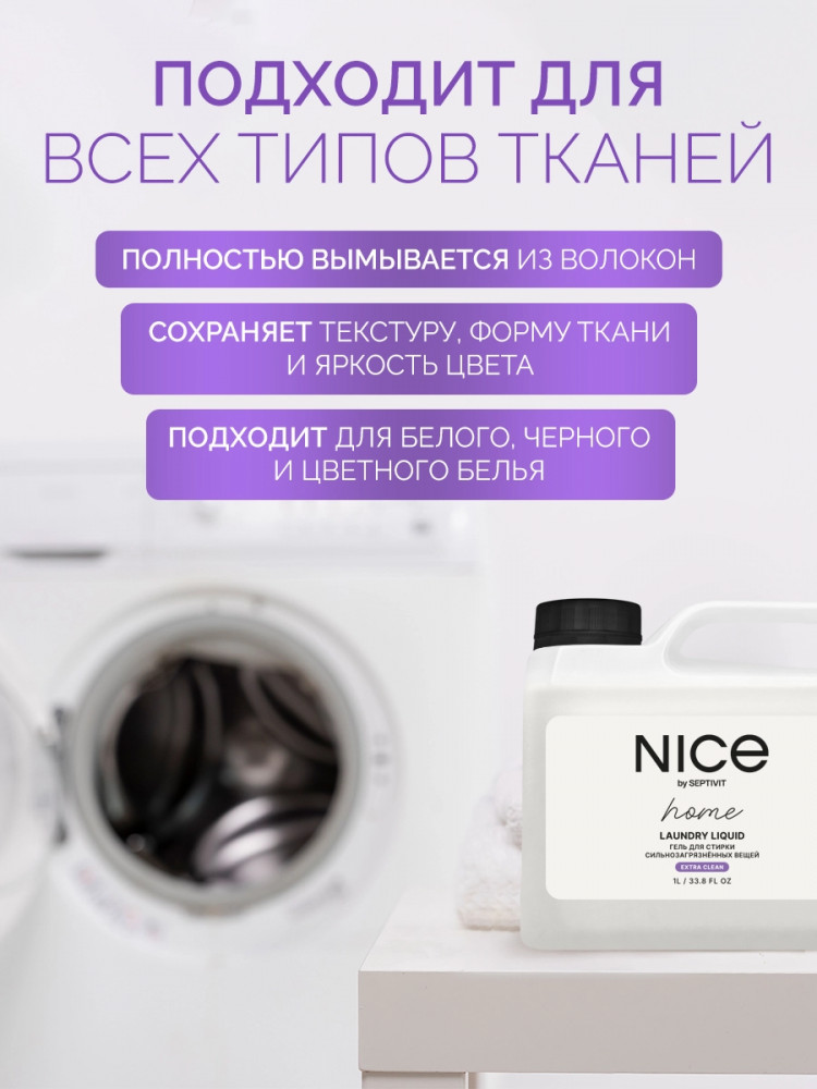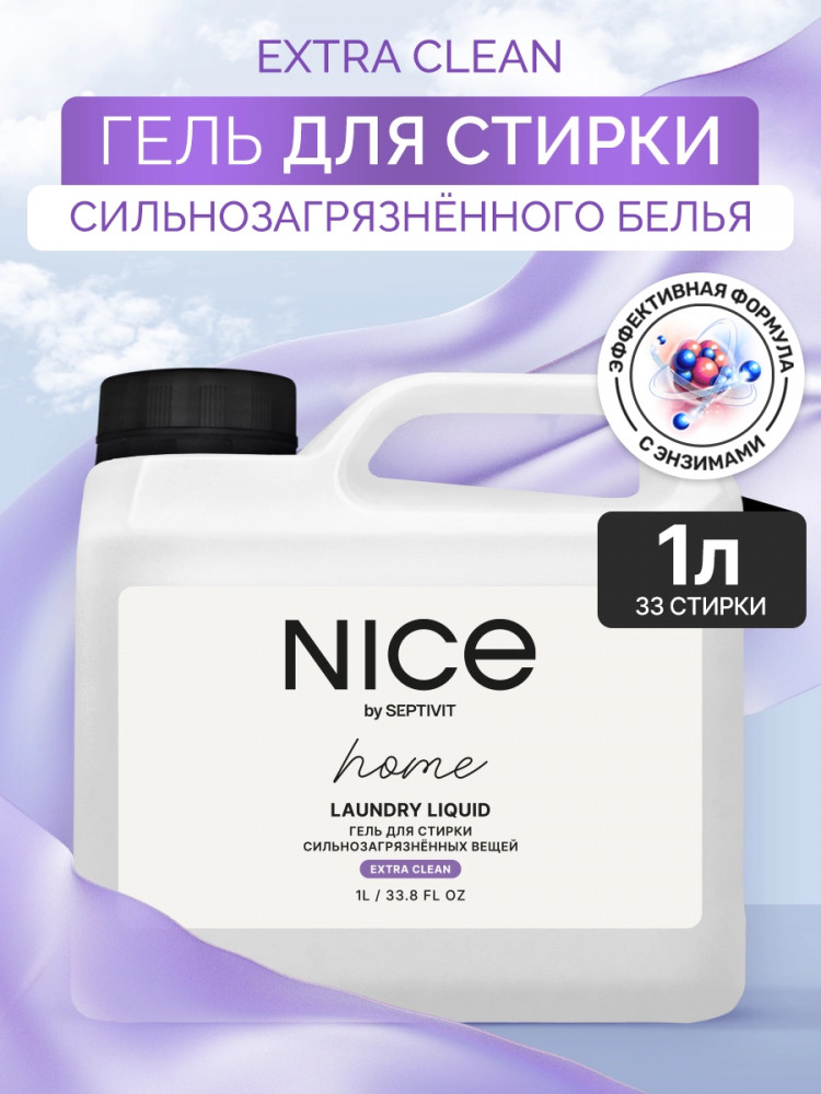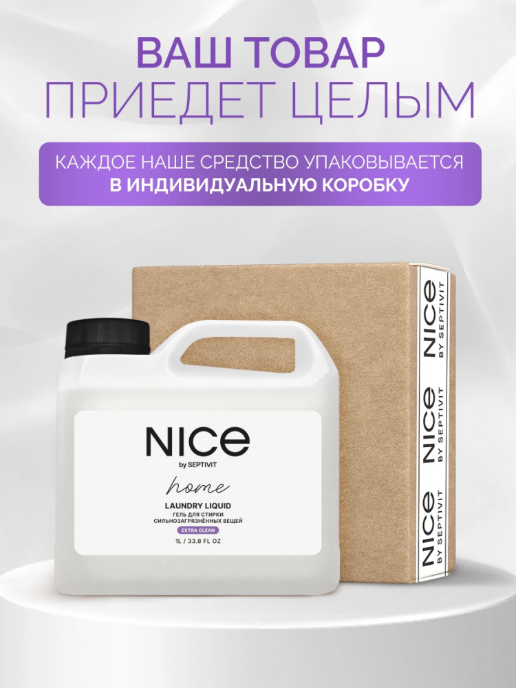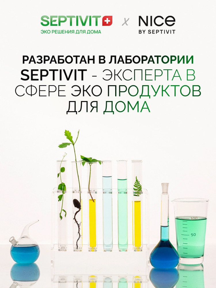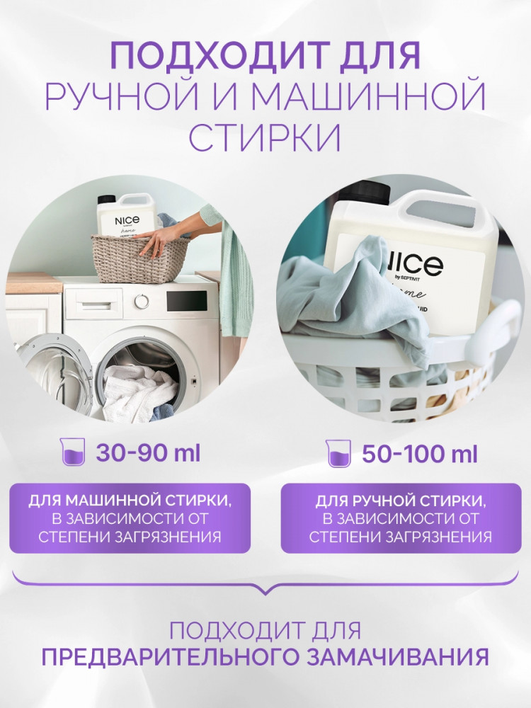 Nice by Septivit — эксперт в сфере эко продуктов для дома. Вся продукция компании разработана в собственной лаборатории Septivit: полностью безопасна для здоровья и экологии, а также не тестируется на животных. Стиральный порошок жидкий разработан специально для стирки сильнозагрязненного белья и вещей из различных видов тканей. Подходит для цветного, белого и черного белья. Усиленная форма средства с энзимами проникает глубоко в ткань и избавляет вещи от пятен и сильных загрязнений — словно эффект химчистки!