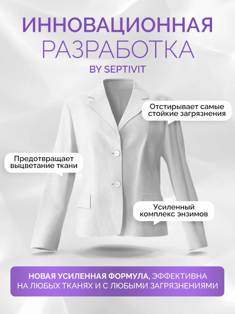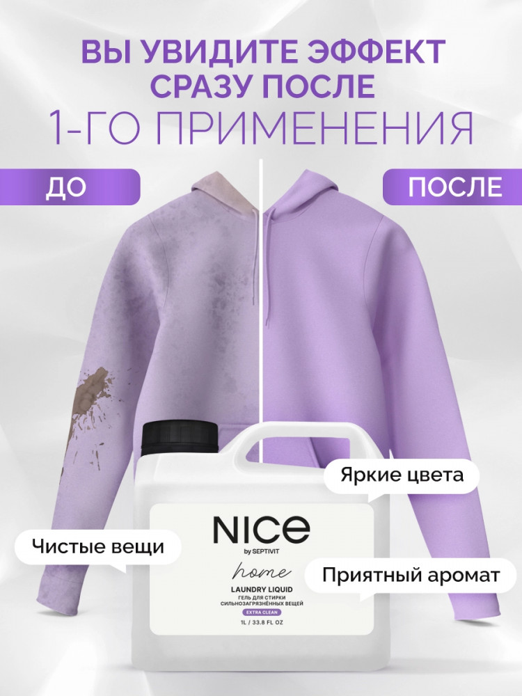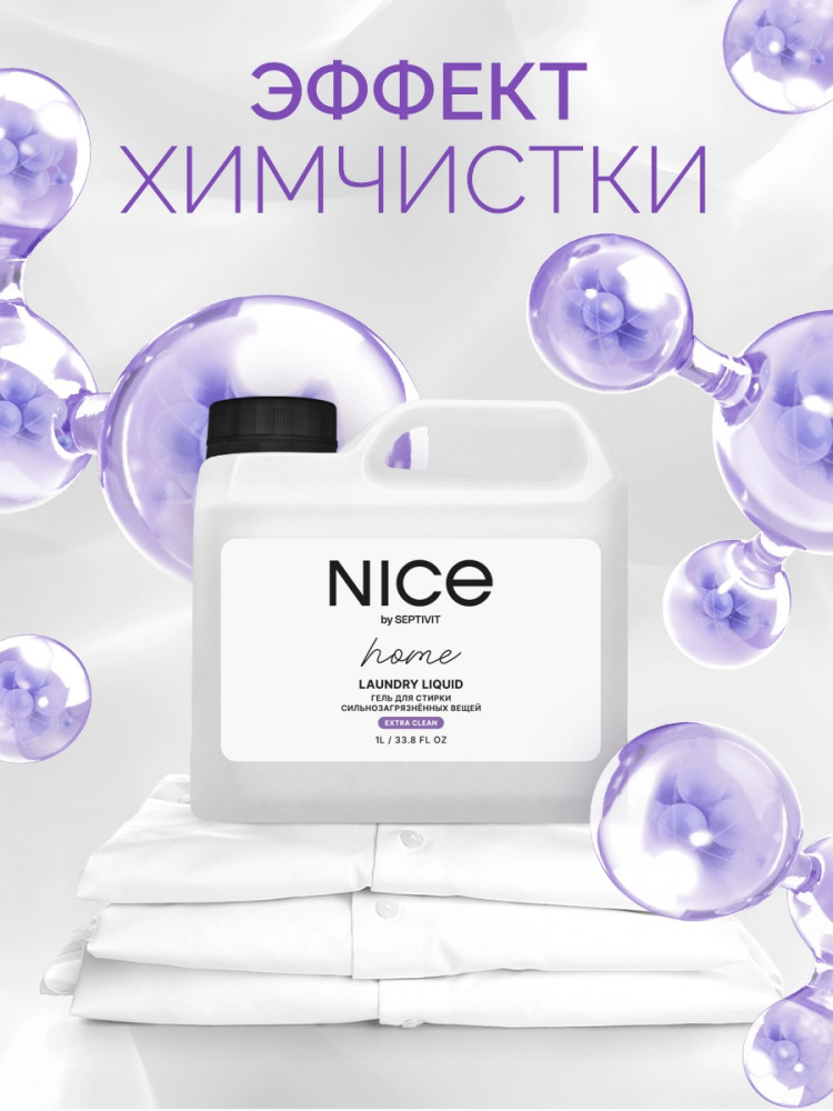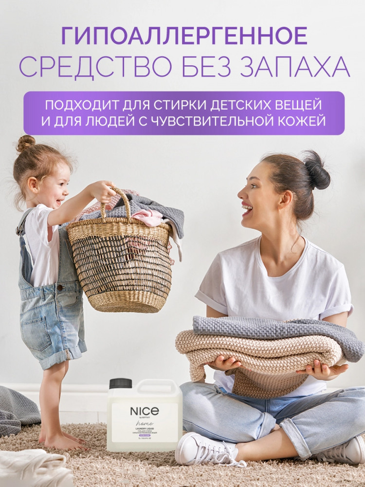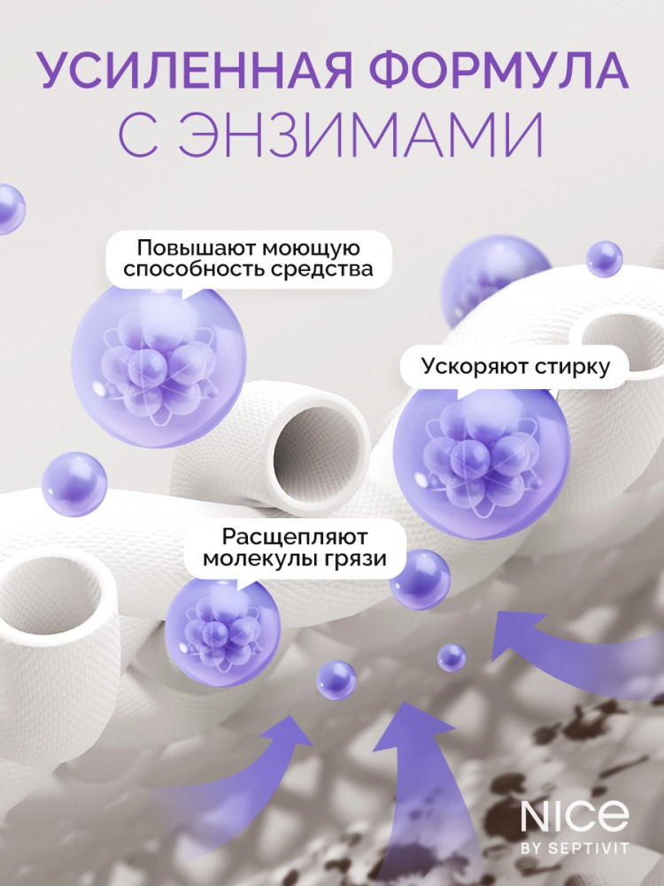 Nice by Septivit — эксперт в сфере эко продуктов для дома. Вся продукция компании разработана в собственной лаборатории Septivit: полностью безопасна для здоровья и экологии, а также не тестируется на животных. Стиральный порошок жидкий разработан специально для стирки сильнозагрязненного белья и вещей из различных видов тканей. Подходит для цветного, белого и черного белья. Усиленная форма средства с энзимами проникает глубоко в ткань и избавляет вещи от пятен и сильных загрязнений — словно эффект химчистки!
