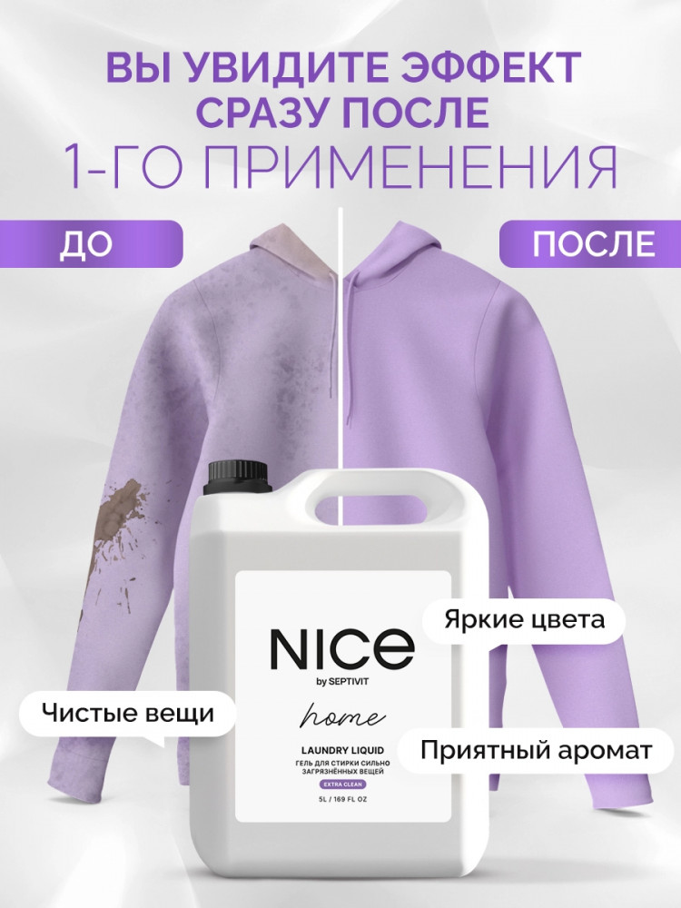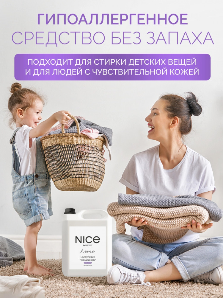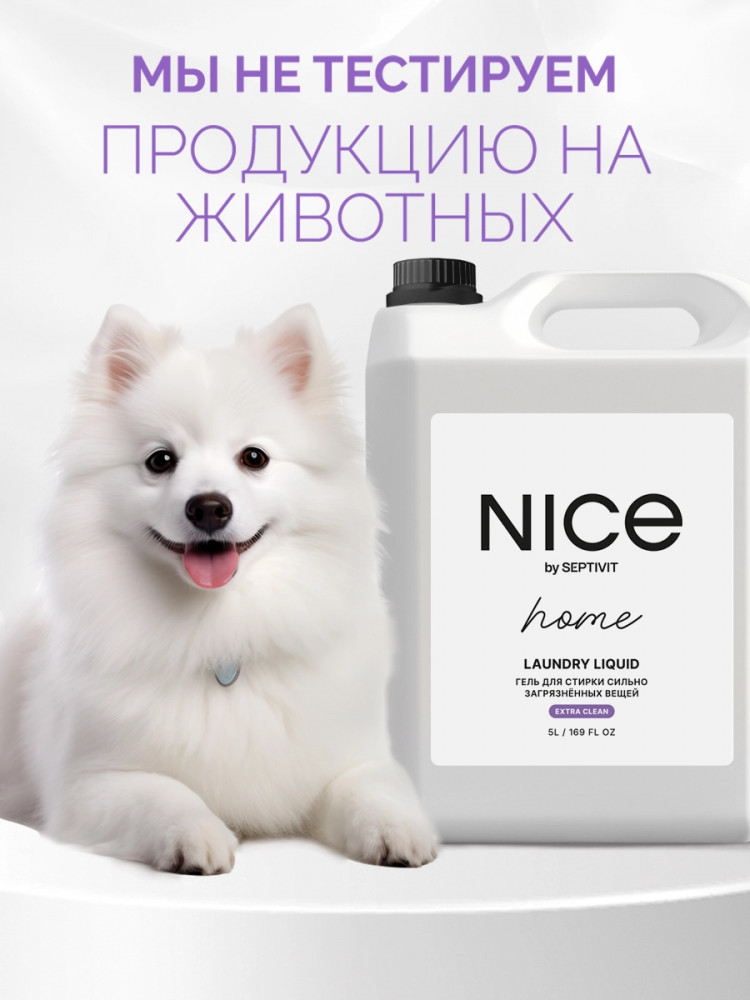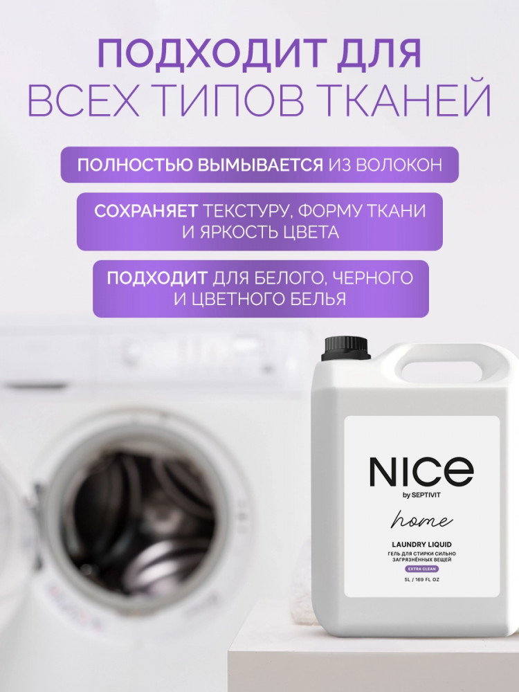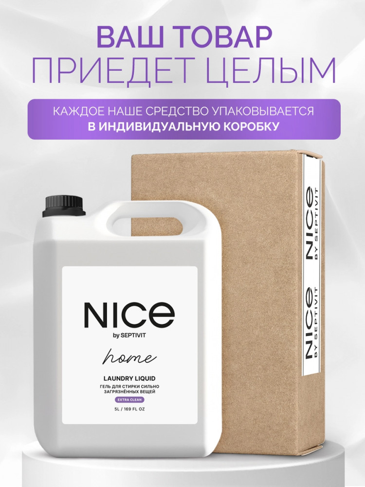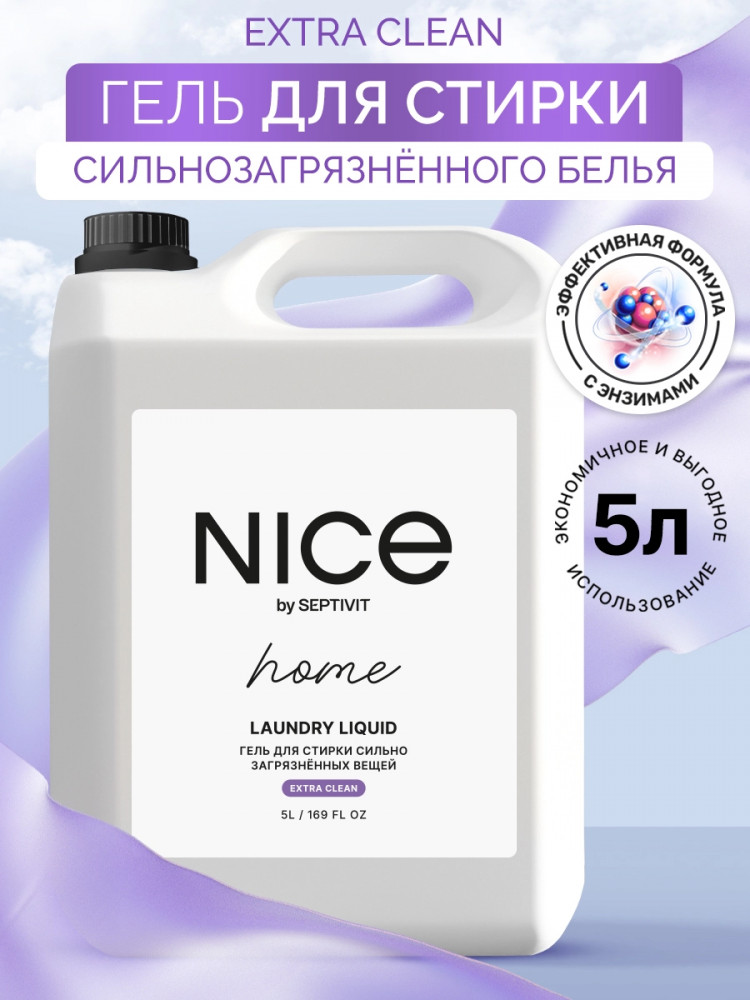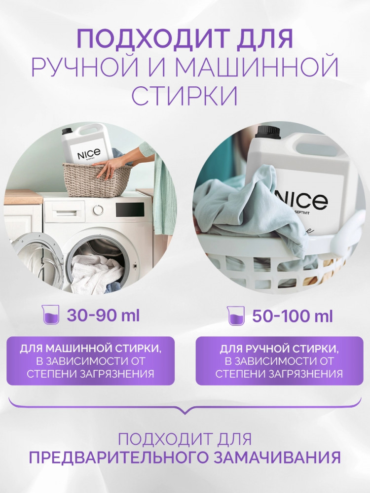 Nice by Septivit — эксперт в сфере эко продуктов для дома. Вся продукция компании разработана в собственной лаборатории Septivit: полностью безопасна для здоровья и экологии, а также не тестируется на животных. Стиральный порошок жидкий разработан специально для стирки сильнозагрязненного белья и вещей из различных видов тканей. Подходит для цветного, белого и черного белья. Усиленная форма средства с энзимами проникает глубоко в ткань и избавляет вещи от пятен и сильных загрязнений — словно эффект химчистки!