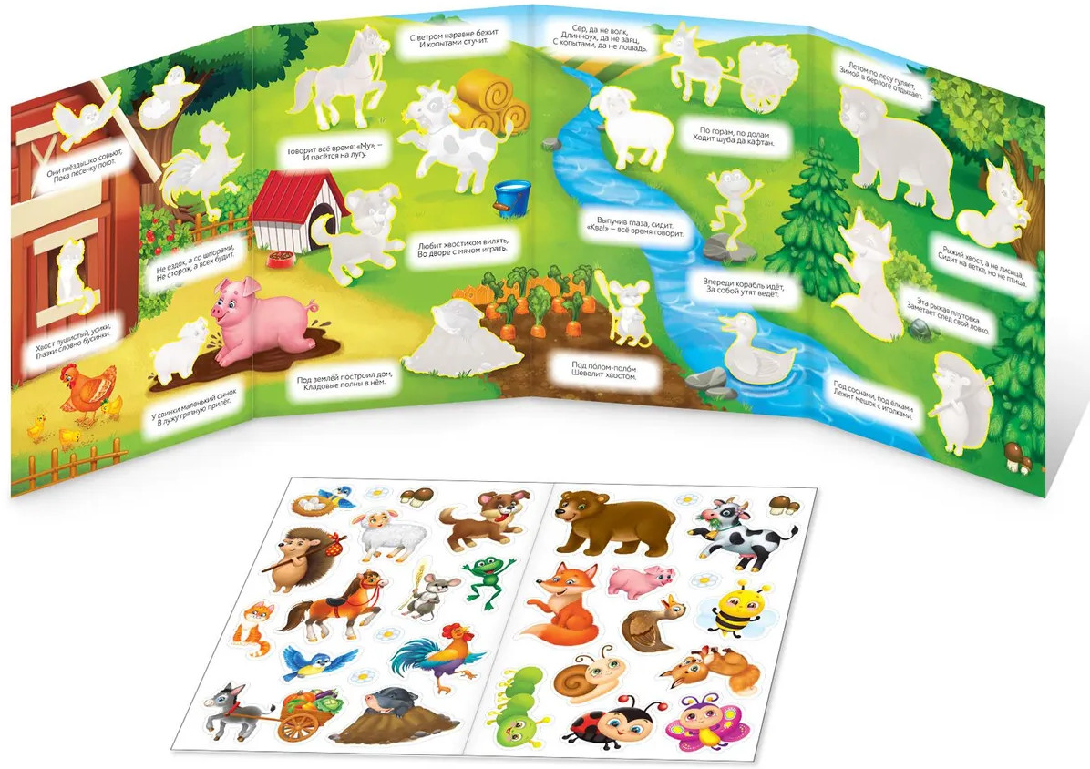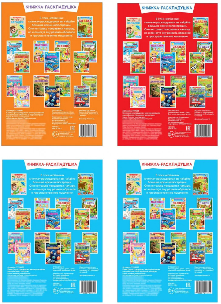 Набор книг с многоразовыми наклейками «Книжки-раскладушки»В данный момент этот товар отсутствует в продаже. Возможно, у нас найдется аналогичный или похожий товар здесь. Книжка-раскладушка раскрывается как плакат — в ней нет переплёта, поэтому ребёнку удобно с ней заниматься. Внутри — яркие иллюстрации, которые не только понравятся малышу, но и помогут развить образное и пространственное мышление. Наклейки многоразовые (можно наклеить 3–4 раза). Рекомендовано для детей от 2 лет. |