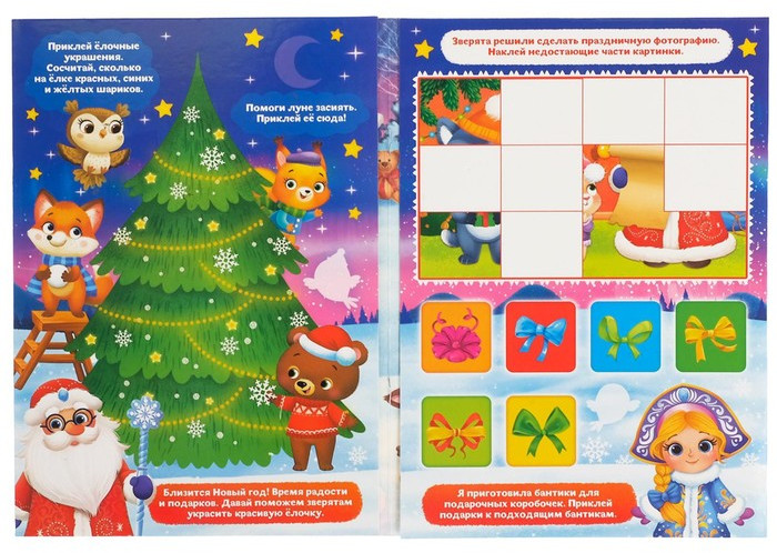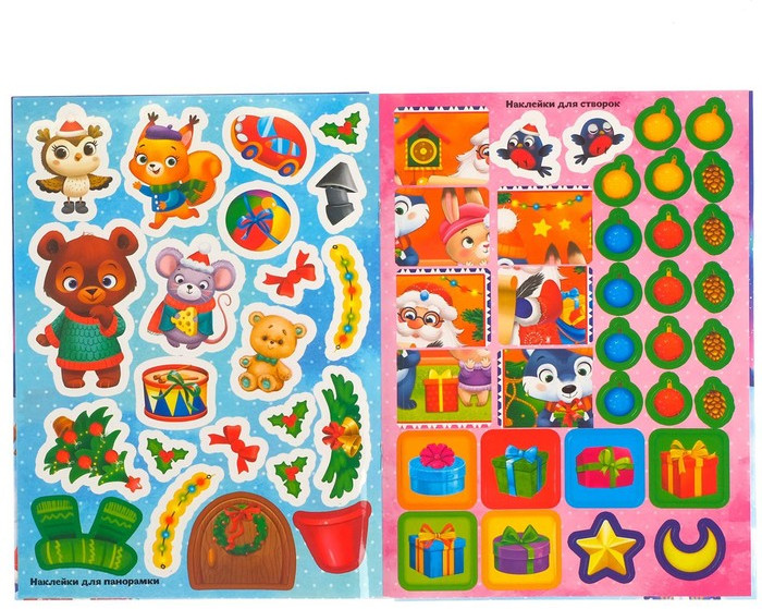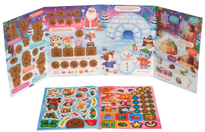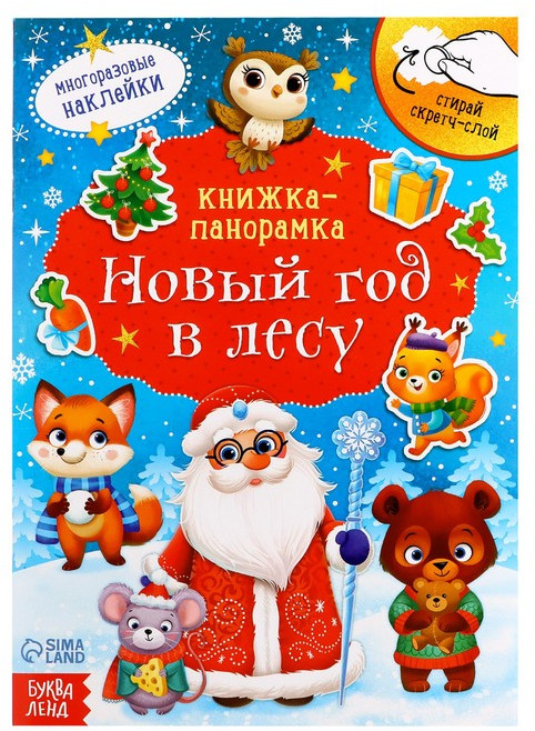 | Книжка-панорамка со скретч-слоем и многоразовыми наклейками «Новый год в лесу»