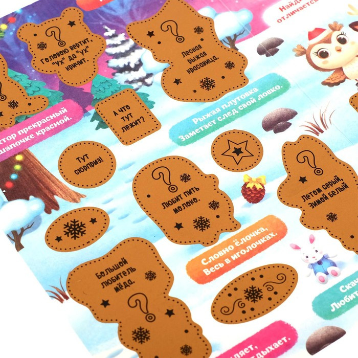 • раскладывается в двусторонний плакат. на каждой стороне есть увлекательные задания: их нужно выполнять с помощью многоразовых наклеек и искать ответы под скретч-слоем;