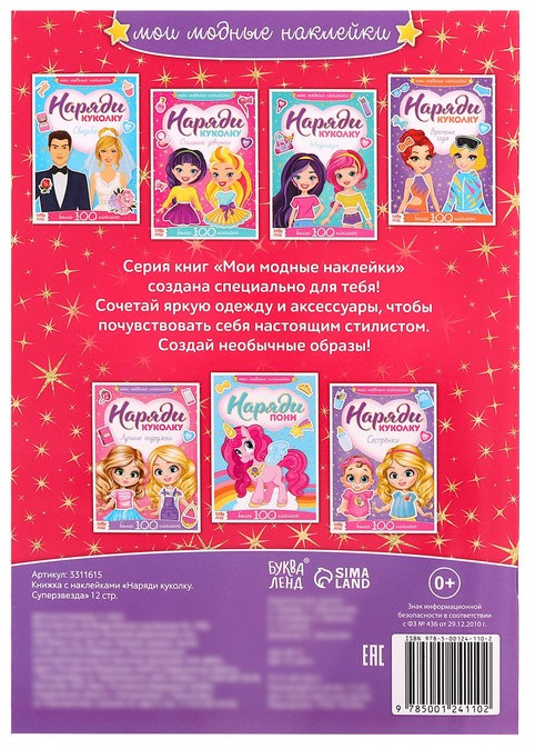 💳 Оплатить за товар можно при получении 🇰🇿 Есть бесплатная доставка по Казахстану от 1 дня 🎁 Копите бонусы с каждой покупки Серия книг «Наряди куколку» создана специально для юных модниц! Ребёнок сможет сочетать яркую одежду и аксессуары и почувствует себя настоящим стилистом. Создавайте вместе с малышкой самые необычные образы.В книге малыша ждёт более 100 цветных наклеек с одеждой и аксессуарами для кукол.Рекомендовано для детей от 3 лет. |