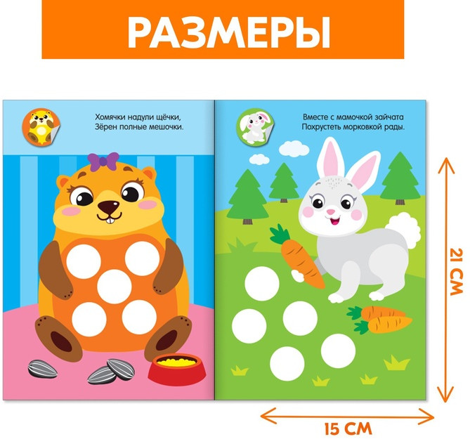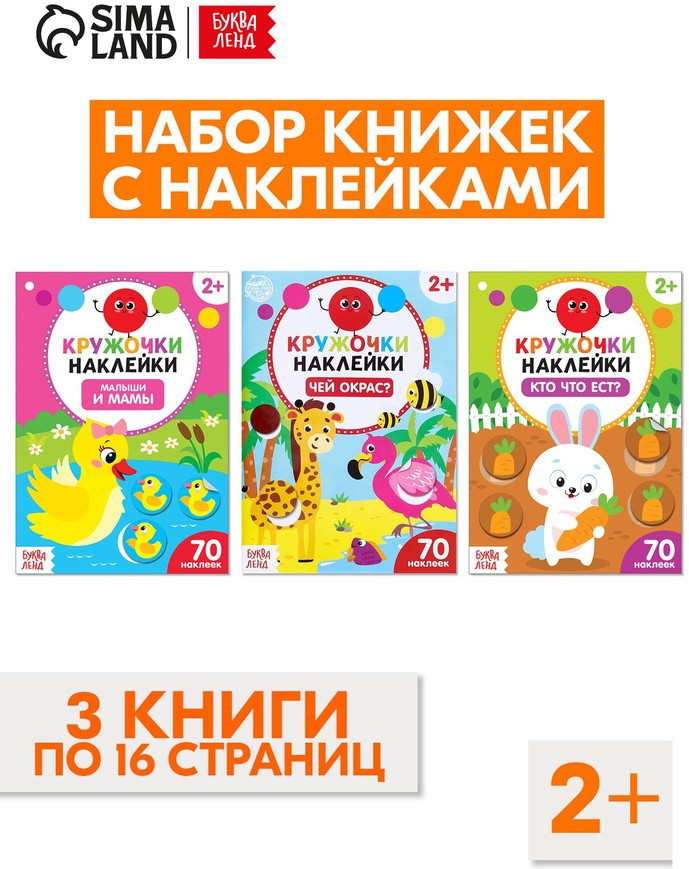 Наклейки-кружочки набор «Знакомимся с животными», 3 шт. по 16 стр.В данный момент этот товар отсутствует в продаже. Возможно, у нас найдется аналогичный или похожий товар здесь. Набор книг с наклейками-кружочками создан для самых маленьких читателей. Приклеивая яркие кружочки, ребёнок узнает много нового об окружающем его мире и потренирует ловкость пальчиков, внимательность и аккуратность.Особенности набора