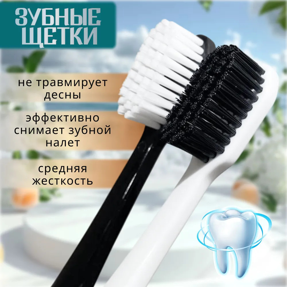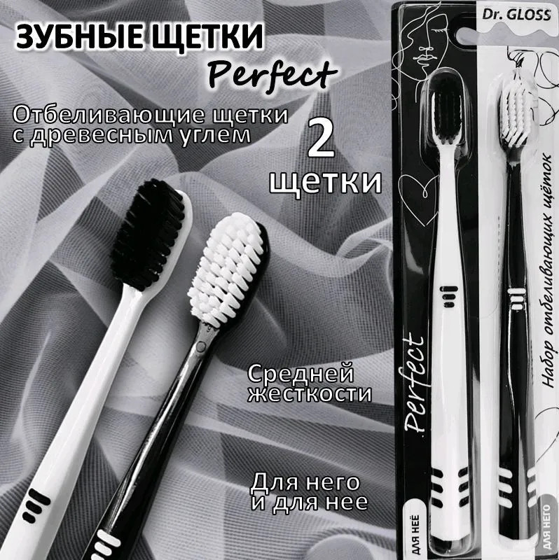 Зубная щетка Dr. Gloss Perfect специально разработана для эффективной чистки труднодоступных мест полости рта. Щетка с щетиной средней жесткости закруглена и не царапает десну. Изделие имеет высокую плотность щетинок. Она бережно относится к зубам и деснам и эффективно очищает полость рта, обеспечивая приятное ощущение чистоты. Щетинки с древесным углем предназначены для бережного отбеливания зубов. Благодаря высокой плотности щетинок зубная щетка удаляет налет разрушая бактериальные связи, а чем меньше бактериальных связей, тем легче очистить поверхность зуба. Не скользящая ручка делает процесс чистки зубов еще удобнее. Щетинки средней жесткости предотвращают кариес и обеспечивают всестороннюю защиту зубов. Жесткость щетины подходит большинству людей. Компактная чистящая головка позволит очистить труднодоступные места. Размер подойдет для комфортного использования щетки с 6 лет. В наборе 2 щетки черного и белого цвета. Подойдут под интерьер современной ванной.
