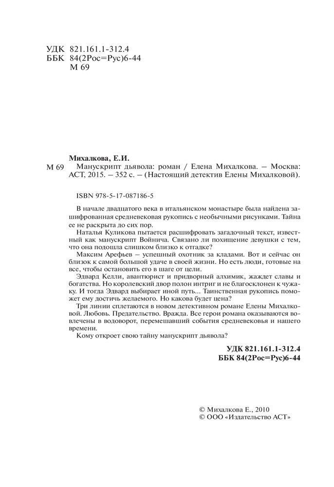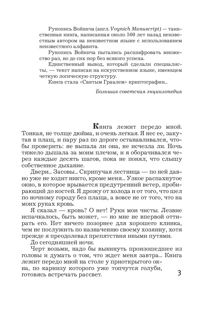 Манускрипт дьяволаВ данный момент этот товар отсутствует в продаже. Возможно, у нас найдется аналогичный или похожий товар здесь. Серия: Настоящий детектив Елены Михалковой В начале двадцатого века в итальянском монастыре была найдена зашифрованная средневековая рукопись с необычными рисунками. Тайна ее не раскрыта до сих пор. Наталья Куликова пытается расшифровать загадочный текст, известный как манускрипт Войнича. Связано ли похищение девушки с тем, что она подошла слишком близко к отгадке? Максим Арефьев - успешный охотник за кладами. Вот и сейчас он близок к самой большой удаче в своей жизни. Но есть люди, готовые на все, чтобы остановить его в шаге от цели. Эдвард Келли, авантюрист и придворный алхимик, жаждет славы и богатства. Но королевский двор полон интриг и не благосклонен к чужаку. И тогда Эдвард выбирает иной путь... Таинственная рукопись поможет ему достичь желаемого. Но какова будет цена? Три линии сплетаются в новом детективном романе Елены Михалковой. Любовь. Предательство. Вражда. Все герои романа оказываются вовлечены в водоворот, перемешавший события средневековья и нашего времени. |