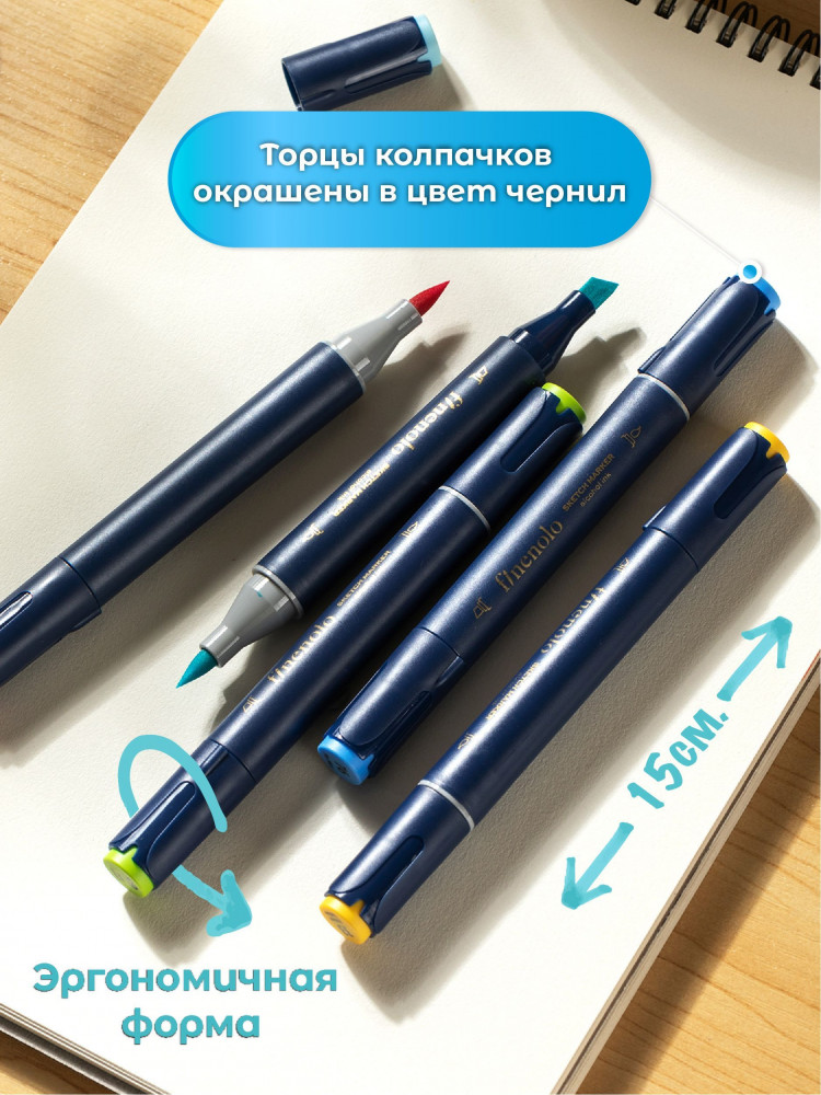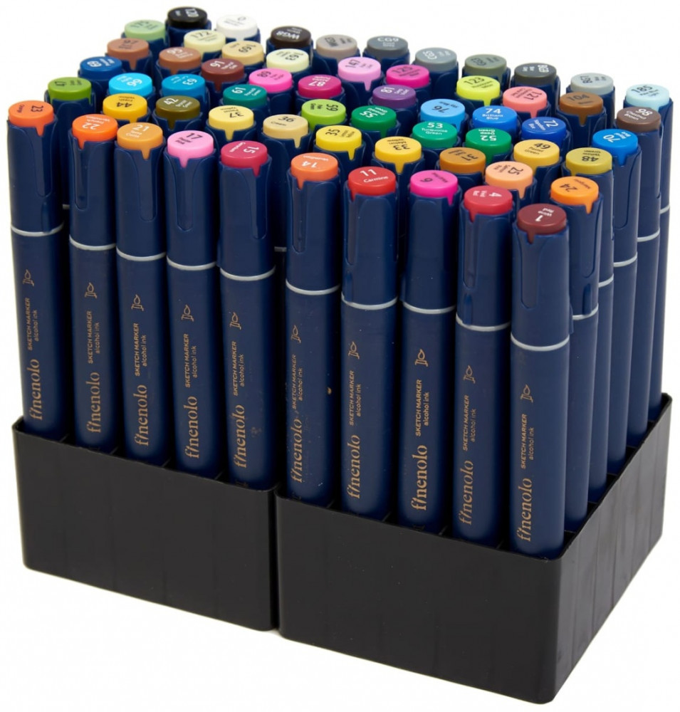 • двусторонние спиртовые маркеры Finenolo представлены палитрой из 60 оттенков — это поможет подобрать нужный цвет или создать свой, путем смешения оттенков между собой;