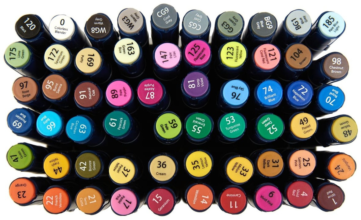 • внабор входят 60 маркеров, включая маркер-блендер с бесцветными чернилами для смешивания цветов и изменения тональности цветов;