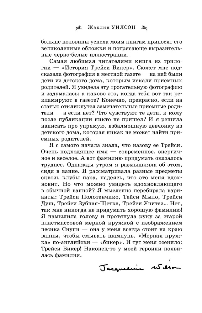 Повести о Трейси Бикер принесли Жаклин Уилсон мировую известность. По ним сняты фильмы, сериалы, поставлены спектакли и даже мюзикл. Хулиганка Трейси один из самых любимых детьми персонажей современной подростковой литературы.