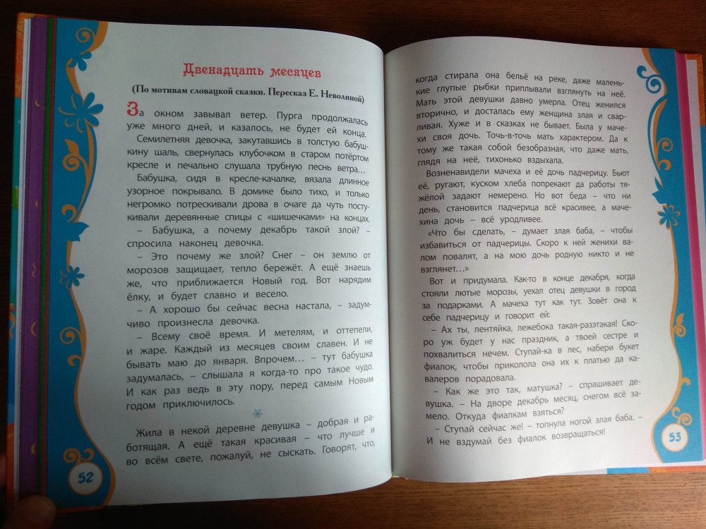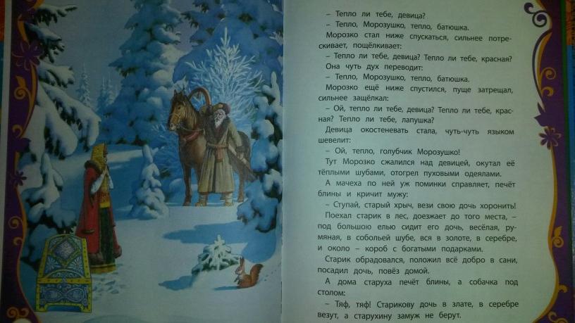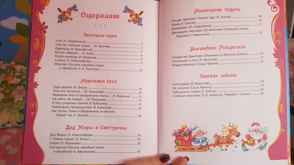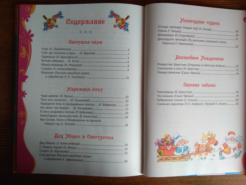 Книга чудесная! Тот самый случай, когда детскую книгу интересно читать и рассматривать картинки не только ребёнку: новогодние праздники – лучшее время, чтобы провести его вместе с сыном или дочерью за её чтением. Оформление: Книга большого формата, красивые цветные иллюстрации на целую страницу – почти на каждом развороте. Каждый из шести разделов выделен своим цветом, что упрощает навигацию по книге. Везде, где нужно, в текстах прописана буква «ё» с точками над ней – так деткам удобнее читать. Содержание: Книга из 6 разделов, в которых размещены стихотворения и сказки на разные новогодние темы: в каждом разделе несколько стихотворений и один прозаический текст (в описании на сайте допущена ошибка: загадок в этой книге нет). Раздел «Зимушка-зима» содержит стихотворения «Утро» А. Твардовского, «Снег да снежные узоры…» А. Круглова, «Одеяльце» А. Коринфского, «Ветхая избушка» А. Блока, «Мороз-воевода» и «Снежок» Н. Некрасова и русскую народную сказку «Морозко» в обработке А. Н. Толстого. Раздел «Наряжаем ёлку» состоит из стихотворений «Чудо-дерево» В. Лунина, «Тихо ель качается…» и «На свете так бывает…» И. Токмаковой, «Нарядили ёлку в праздничное платье…» К. Фофанова, «В лесу родилась ёлочка» Р. Кудашевой, «Новогоднее происшествие» В. Берестова и сказка С. Козлова «Как Ослик, Ёжик и Медвежонок встречали Новый год». Раздел «Дед Мороз и Снегурочка» составлен из стихотворений «Дед Мороз» З. Александровой, «Дед Мороз» А. Шибаева, «Секрет» Е. Корсаковой и русской народной сказки «Снегурочка» в обработке А. Афанасьева (это та сказка, где Снегурочка растаяла, прыгая через костёр с подружками). Раздел «Новогодние чудеса» порадует ребят стихотворениями «Откуда приходит Новый год?» А. Усачёва, «Утром» Г. Галиной, «Фейерверк» Н. Скороденко и сказкой «Двенадцать месяцев», пересказанной Е. Неволиной по мотивам словацкой сказки (это не та сказка, где падчерица отправлялась в зимний лес за подснежниками, сюжет немного оличается). Раздел «Волшебное Рождество» состоит из стихотворения «Рождественское» С. Чёрного, отрывка из стихотворения «Рождественская звезда» Б. Пастернака и отрывка из детской Библии о Рождестве Христовом. Последний раздел – «Зимние забавы», здесь расположены стихотворения «Гололедица» В. Берестова, «На коньках» С. Чёрного, «Бабушкины сказки» С. Есенина и сказка Х.-К. Андерсена «Снежная королева» в переводе А. Ганзен (отмечу, что сказка здесь адаптированная, в таком виде, как публиковалась в СССР, без цитат из Евангелия и Псалтири, без упоминания ангелов, которые приходят на помощь Герде после её молитвы).