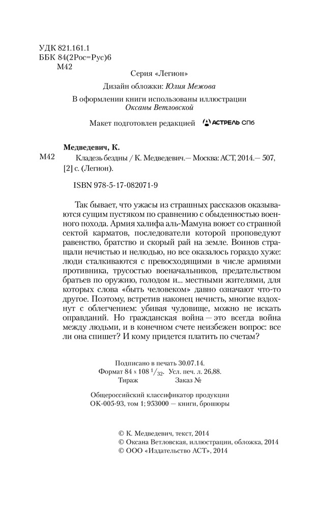Кладезь бездныВ данный момент этот товар отсутствует в продаже. Возможно, у нас найдется аналогичный или похожий товар здесь. Серия: Легион Так бывает, что ужасы из страшных рассказов оказываются сущим пустяком по сравнению с обыденностью военного похода. Армия халифа аль-Мамуна воюет со странной сектой карматов, последователи которой проповедуют равенство, братство и скорый рай на земле. Воинов стращали нечистью и нелюдью, но все оказалось гораздо хуже: люди сталкиваются с превосходящими в числе армиями противника, трусостью военачальников, предательством братьев по оружию, голодом и... местными жителями, для которых слова «быть человеком» давно означают что-то другое. Поэтому, встретив наконец нечисть, многие вздохнут с облегчением: убивая чудовище, можно не искать оправданий. Но гражданская война — это всегда война между людьми, и в конечном счете неизбежен вопрос: все ли она спишет? И кому придется платить по счетам? |
