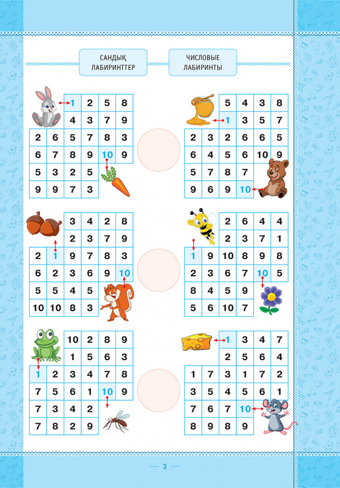 1-ден 10-ға дейінгі сандарды өсу және кему ретіне қарай бастапқы нүктеден бастап соңына дейін сандары бар ұяшықтарды бояу керек. Осы тапсырмаларды орындаған кезде бала цифрдың жазылуын есінде сақтайды, санау қабілеті жетіледі, есте сақтауы мен шыдамдылықтарын жаттықтырады.