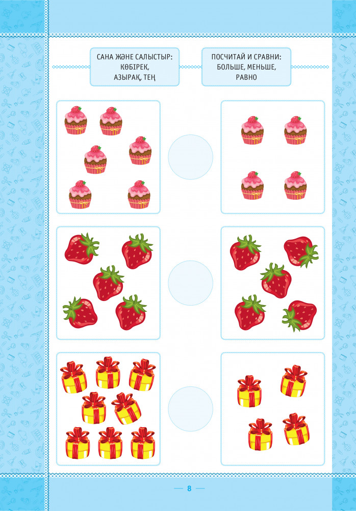 Балаңызға суреттерді көруді және оң және сол жақтағы заттарды санауды, сосын жапсырмалардың көмегімен олардың арасына қажетті (көбірек, азырақ, тең) таңбаларын «қоюды» ұсыныңыз.
