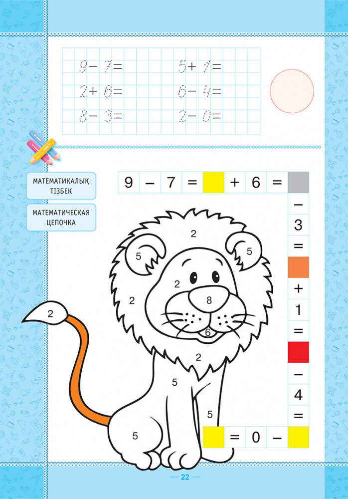 Ребёнок должен решить примеры в цепочке и в соответствии с полученным цветовым кодом, раскрасить картинку. Обратите внимание ребёнка, на то, что очень важно сделать всё правильно, потому что ошибка в одном месте приведёт к неточности в другом. Рекомендуется для использования на занятиях в дошкольных учреждениях и при индивидуальной подготовке к школе. |