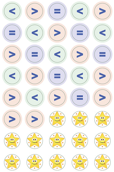 Предложите ребёнку рассмотреть картинки, посчитать количество предметов слева и справа, а затем с помощью наклейки «поставить» между ними нужный знак (больше, меньше, равно).