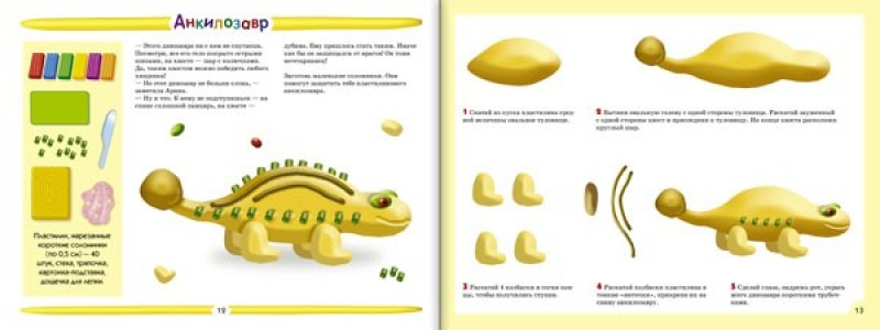 В начале каждого занятия дается изображение фигуры динозавра из пластилина, далее изображение рассмотрено по деталям и элементам.