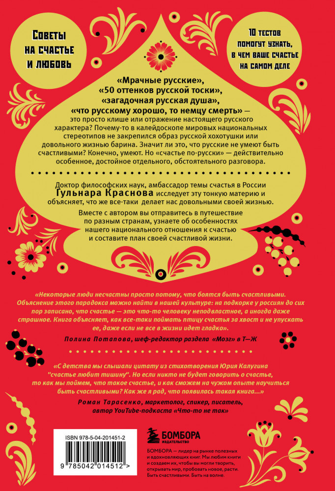 «Мрачные русские», «50 оттенков русской тоски», «загадочная русская душа», «что русскому хорошо, то немцу смерть» — это просто клише или отражение настоящего русского характера? Почему-то в калейдоскопе мировых национальных стереотипов не закрепился образ русской хохотушки или довольного жизнью барина. Значит ли это, что русские не умеют быть счастливыми? Конечно, умеют. Но «счастье по-русски» — действительно особенное, достойное отдельного обстоятельного разговора. Доктор философских наук, амбассадор темы счастья в России Гульнара Краснова исследует эту тонкую материю и объясняет, что же все-таки делает нас довольными своей жизнью. Вместе с автором вы отправитесь в путешествие по разным странам, узнаете об особенностях нашего национального отношения к счастью и составите план своей счастливой жизни.