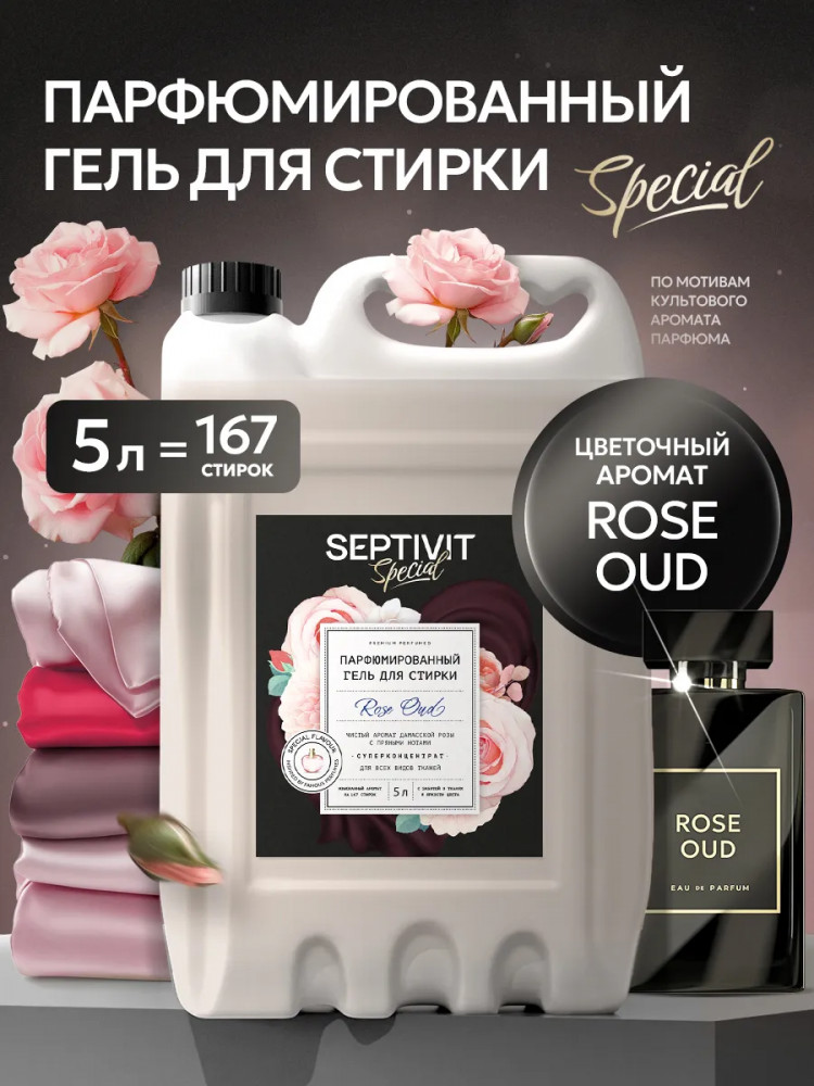 Подарите своей одежде нежность и цветочный аромат с парфюмированным гелем для стирки Rose Oud. Он не только обеспечит безупречную чистоту вещей, но и создаст приятные ощущения от использования. Продукция поставляется в удобной канистре на 5 литров, которой хватит на 167 стирок. Созданный на основе эксклюзивной формулы, включающей в себя высококачественные компоненты, парфюмированный гель Rose Oud деликатно ухаживает за тканями, сохраняя их цвет и текстуру. Сочетание нот дамасской розы, благовоний и уда создаёт неповторимый аромат, который будет окружать вас целый день. Формула геля разработана специально для эффективного удаления загрязнений и пятен при минимальном расходе средства. Благодаря концентрированной текстуре, достаточно небольшого количества добавления геля, чтобы добиться идеальной чистоты одежды. Данный гель для стирки идеально подходит для всех типов тканей – натуральных, искусственных, синтетических, а также деликатных материалов и детского белья. Благодаря ультрамягкой формуле, гель бережно удаляет загрязнения даже при низкой температуре стирки, сохраняя структуру волокон. Парфюмированный гель для стирки Rose Oud – это отличный выбор для тех, кто ценит качество очистки загрязнений, удобство использования и приятные ощущения от одежды. Погрузитесь в мир изысканных ароматов с этим уникальным продуктом. Заказывайте гель для стирки и создавайте неповторимый шарм для вашей повседневной одежды. Раскройте свою индивидуальность с помощью парфюмированного геля для стирки Rose Oud!