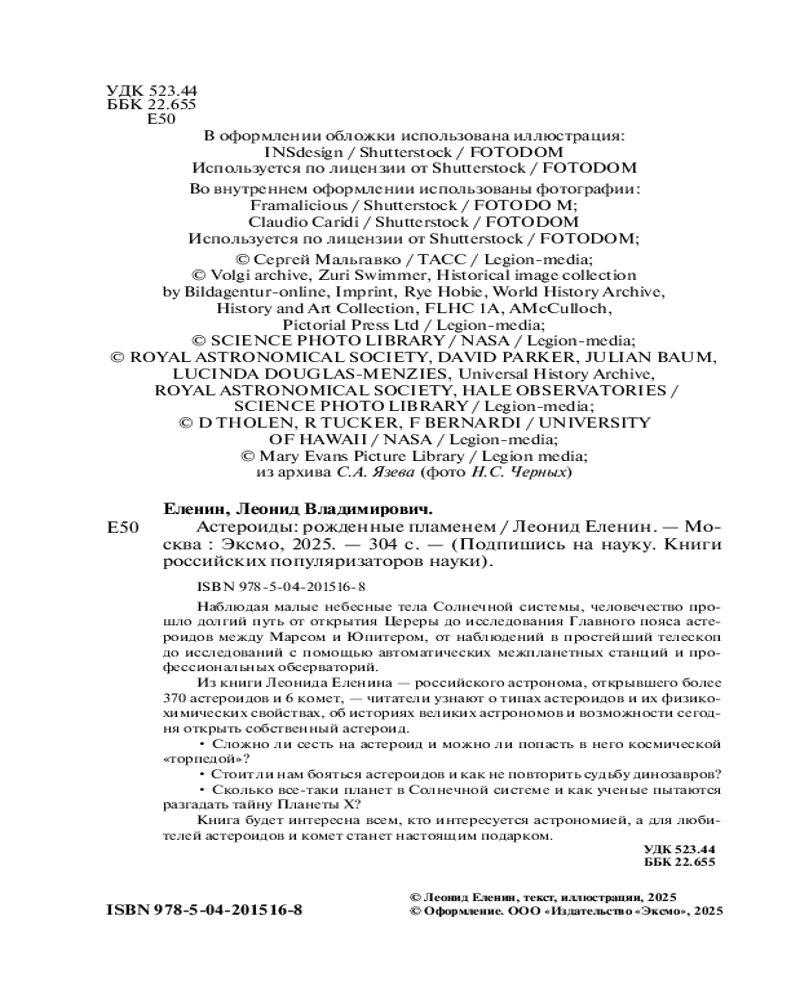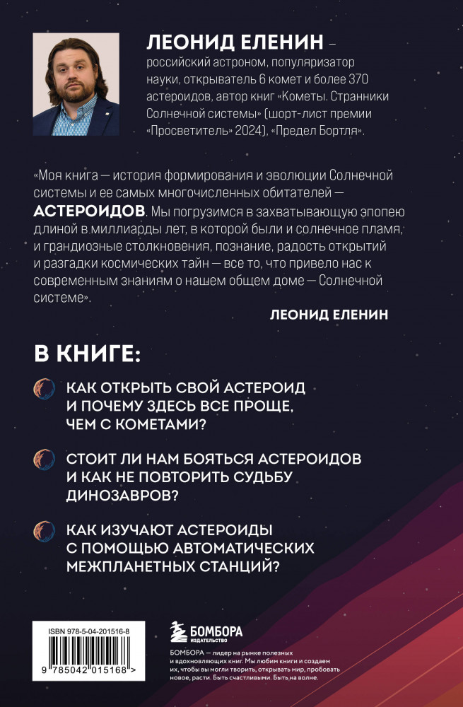 Серия: Подпишись на науку. Книги российских популяризаторов науки «Моя книга — история формирования и эволюции Солнечной системы и ее самых многочисленных обитателей — астероидов. Мы погрузимся в захватывающую эпопею длиной в миллиарды лет, в которой были и солнечное пламя, и грандиозные столкновения, познание, радость открытий и разгадки космических тайн — все то, что привело нас к современным знаниям о нашем общем доме — Солнечной системе». — Леонид Еленин, российский астроном, популяризатор науки, открыватель 6 комет и более 370 астероидов, автор книг «Кометы. Странники Солнечной системы» (шорт-лист премии «Просветитель» 2024), «Предел Бортля».