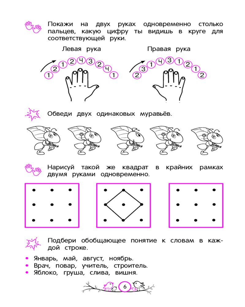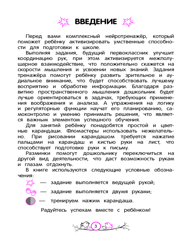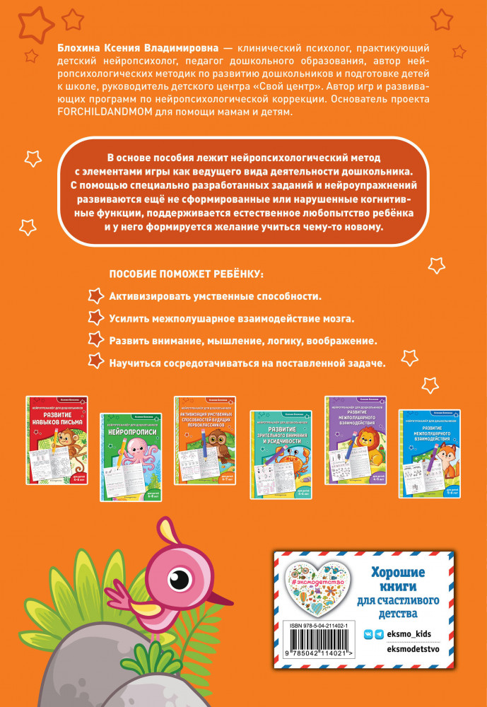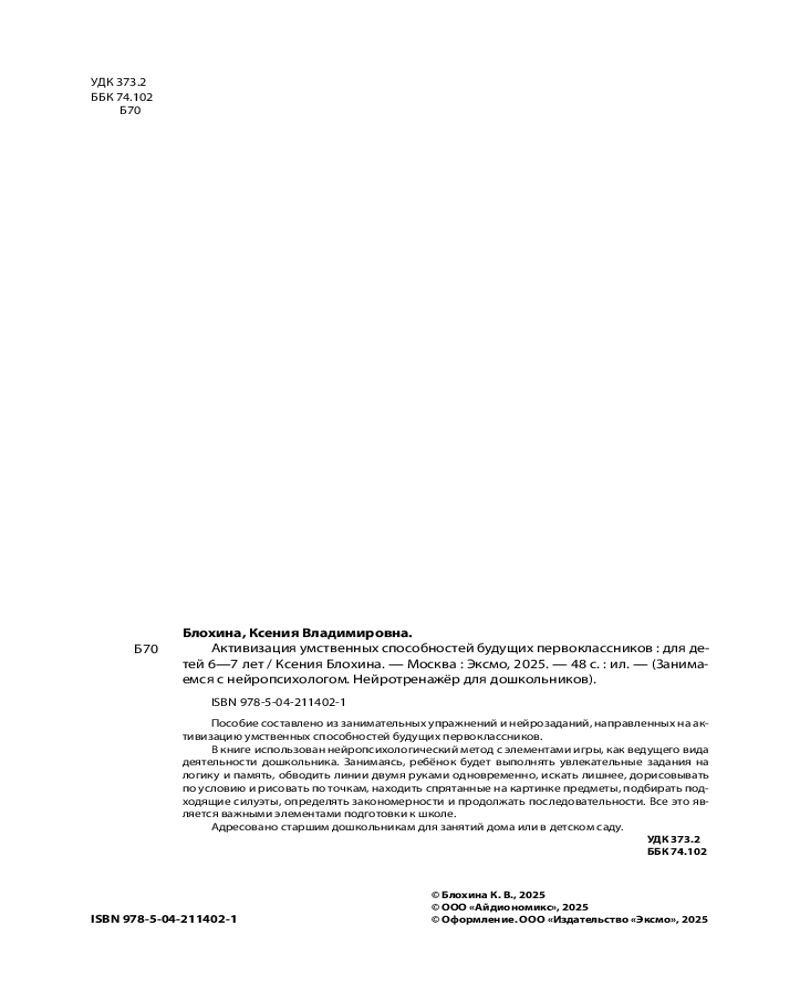 💳 Оплатить за товар можно при получении 🇰🇿 Есть бесплатная доставка по Казахстану от 1 дня 🎁 Копите бонусы с каждой покупки Серия: Занимаемся с нейропсихологом. Нейротренажер для дошкольников (обложка) Обучающее пособие от издательства «Эксмо» разработано практикующим нейропсихологом и поможет ребёнку активизировать умственные способности, основываясь на нейропсихологическом методе обучения. Чем лучше взаимодействуют оба полушария, тем эффективнее дошкольник воспринимает информацию и адаптируется к новым видам деятельности. Занимаясь, ребёнок будет рисовать по точкам и обводить линии двумя руками одновременно, выполнять логические задания на ассоциации и на память, искать лишнее, дорисовывать по условию, находить спрятанные на картинке предметы, подбирать подходящие силуэты, заполнять логические квадраты, определять закономерности и продолжать последовательности. |