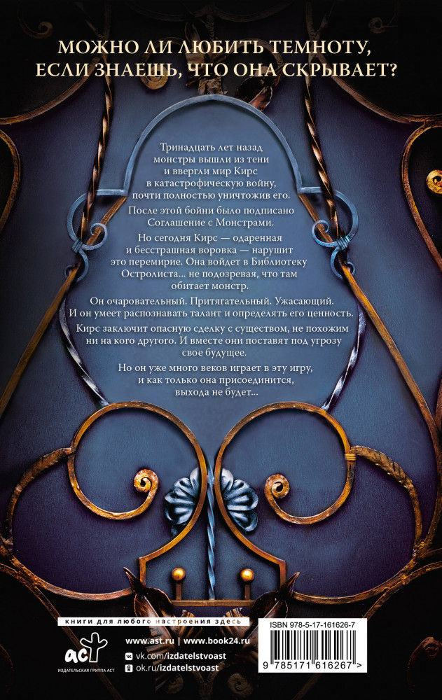 💳 Оплатить за товар можно при получении 🇰🇿 Есть бесплатная доставка по Казахстану от 1 дня 🎁 Копите бонусы с каждой покупки Серия: BUZZ Тринадцать лет назад монстры вышли из тени и ввергли мир Кирс в катастрофическую войну, почти полностью уничтожив его. После этой бойни было подписано Соглашение с Монстрами. Но сегодня Кирс — одаренный и бесстрашный вор — нарушит это перемирие. Она войдет в Библиотеку Остролиста... не подозревая, что там обитает монстр. Он очаровательный. Притягательный. Ужасающий. И он умеет распознавать талант и определять его ценность. Кирс заключит опасную сделку с существом, не похожим ни на кого другого. И вместе они поставят под угрозу свое будущее. Но он уже много веков играет в эту игру, и как только она присоединится, выхода не будет... |