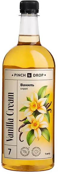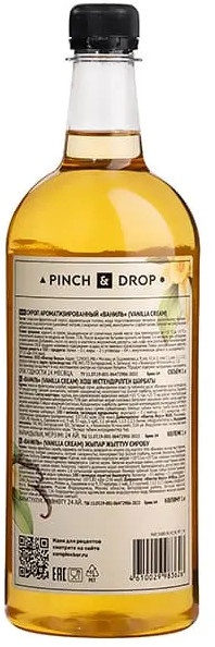 Сироп бренда Pinch&Drop насыщен вкусом ванильного крема. Этот продукт изготовлен из натуральных ингредиентов, сертифицирован по ГОСТу и безопасен. Создан для приготовления напитков и десертов, для придания им терпкой сладости. Поставляется в легкой пластиковой бутылки объемом 1 литр. Такого количества сиропа хватает на длительный период даже при активном использовании. В его составе пищевой ароматизатор «Ваниль-сливки», именно он придает фруктозно-глюкозному сиропу (основе продукта) такой насыщенный аромат. Сочетание других ингредиентов обеспечивает вкус ванили со сливочными нотками.