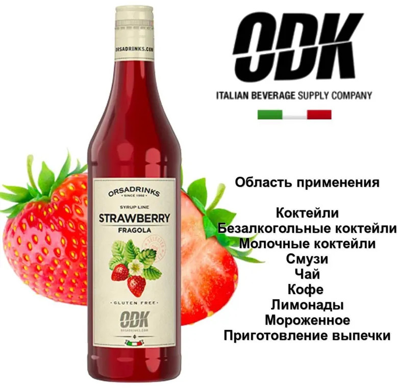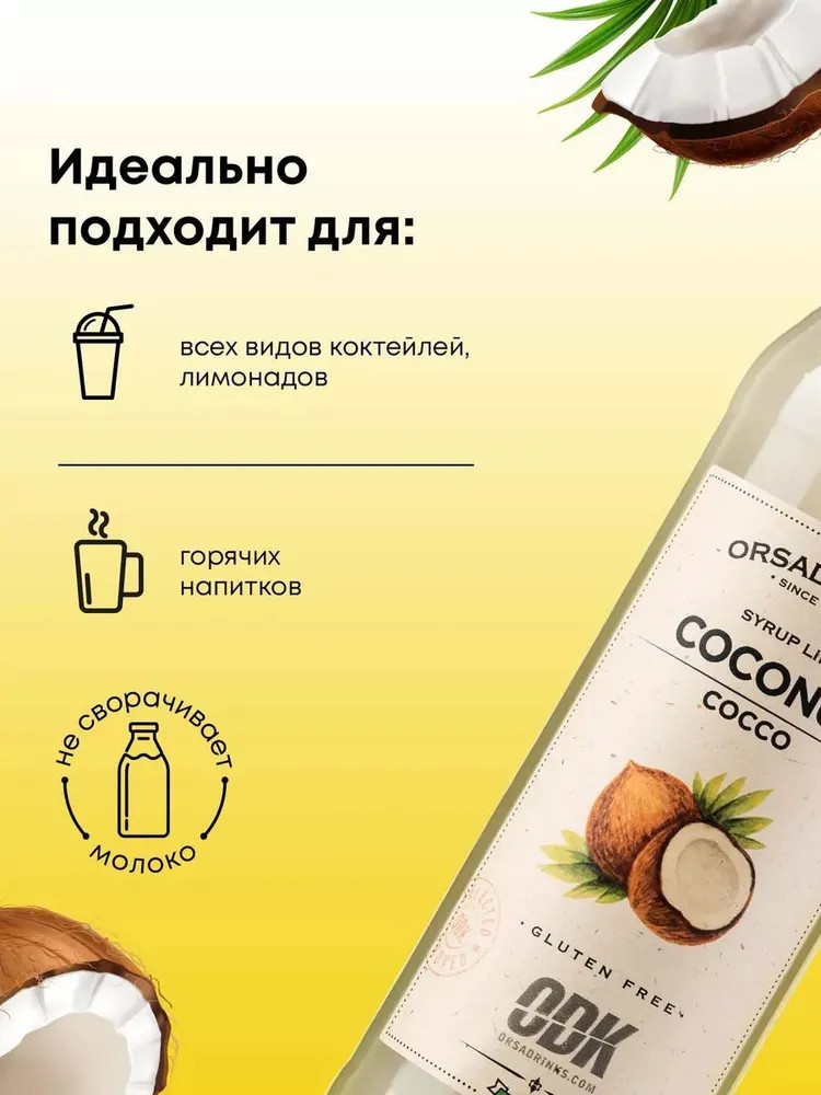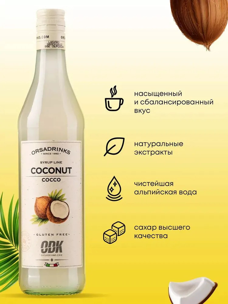 Итальянский производитель «ОДК» изготавливает сиропы с разными вкусами. Один из самых популярных — кокос. Он сделан из натуральных компонентов, густой, имеет белый цвет и насыщенный аромат экзотического плода. Сироп ODK продается в характерной для таких товаров таре — бутылках из стекла. За счет уваривания и высокой концентрации сахара до вскрытия он имеет длительный срок хранения, не портится при пересылке. Объема бутылки в 750 мл достаточно для интенсивного использования в барах, ресторанах.