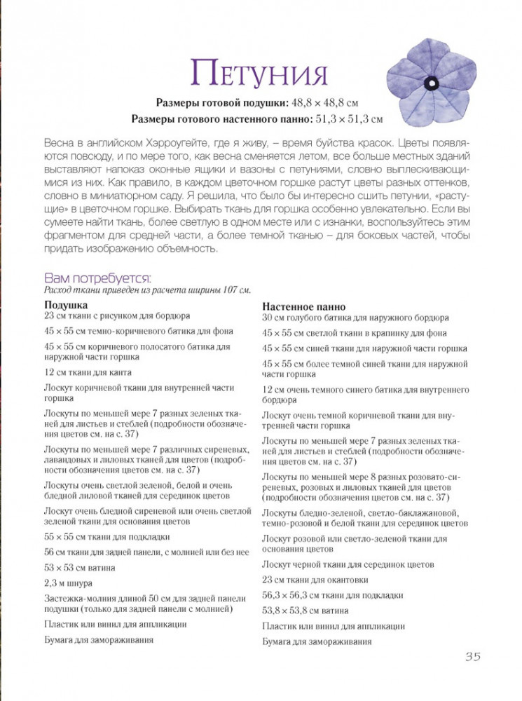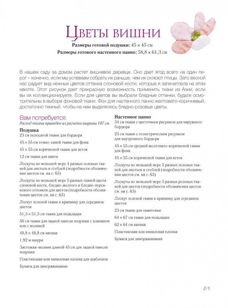 Цветочные подушки и панноВ данный момент этот товар отсутствует в продаже. Возможно, у нас найдется аналогичный или похожий товар здесь. Всем известно, что можно легко оживить интерьер, добавить изысканности и расставить акценты, разложив красивые, яркие подушки в гостиной, спальне и даже на кухне. Любительницы пэчворка и лоскутного шитья будут рады попробовать себя в роли декоратора и создать свои собственные неповторимые украшения для дома, получив при этом массу удовольствия от любимого вида хобби. Каждый из девяти проектов, предлагаемых в книге, представлен в двух вариантах – подушка и настенный гобелен – и в двух цветовых гаммах, что в общей сложности дает восемнадцать потрясающих идей для творчества. |