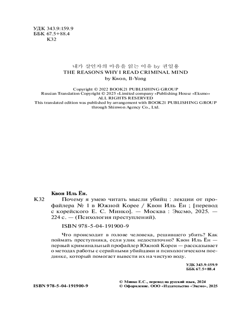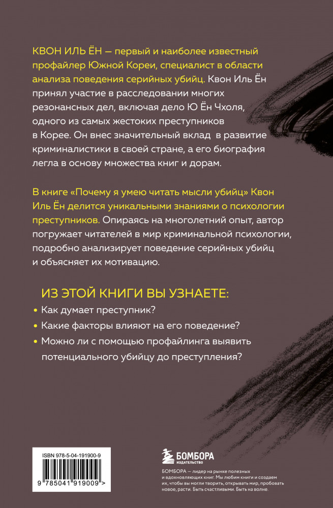 💳 Оплатить за товар можно при получении 🇰🇿 Есть бесплатная доставка по Казахстану от 1 дня 🎁 Копите бонусы с каждой покупки Серия: Психология преступлений Квон Иль Ён — первый и наиболее известный профайлер Южной Кореи, специалист в области анализа поведения серийных убийц. Квон Иль Ён принял участие в расследовании многих резонансных дел, включая дело Ю Ён Чхоля, одного из самых жестоких преступников в Корее. Он внёс значительный вклад в развитие криминалистики в своей стране, а его биография легла в основу множества книг и дорам. В книге «Почему я читаю мысли убийцы» Квон Иль Ён делится уникальными знаниями о психологии преступников. Опираясь на многолетний опыт, автор погружает читателей в мир криминальной психологии, подробно анализирует поведение серийных убийц и объясняет их мотивацию. |