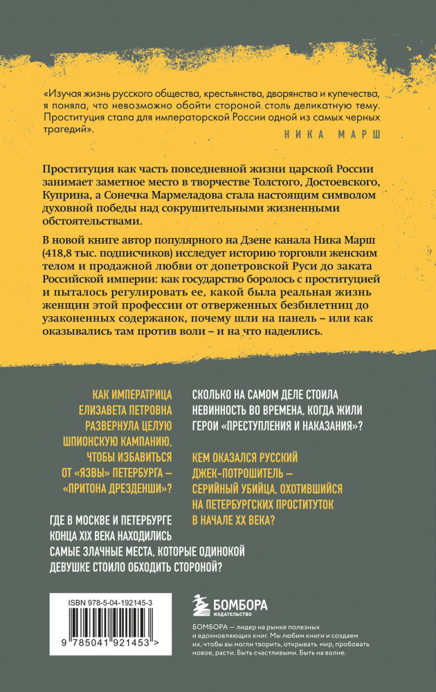 💳 Оплатить за товар можно при получении 🇰🇿 Есть бесплатная доставка по Казахстану от 1 дня 🎁 Копите бонусы с каждой покупки Серия: Ника Марш. История — это интересно В новой книге писательница и блогер Ника Марш (автор бестселлеров «Княжна на продажу», «Крепкие узы», «Дом наизнанку» и «Жестокий брак») смело знакомит читателя с «блеском и нищетой» публичных домов XIX–XX веков, где роскошь соседствовала с отчаянием, а за внешней благопристойностью скрывались тяжкие преступления. Вы узнаете, как жили женщины этой профессии: «бланковые» одиночки и официально зарегистрированные «желтобилетницы», их хваткие «мамки», «няньки», «генеральши», а также «актерки», танцовщицы и певицы, которые автоматически приравнивались современниками к содержанкам, как проституция была связана с криминальным миром и как государство в разные эпохи пыталось бороться с этим явлением или во всяком случае взять его под контроль. |