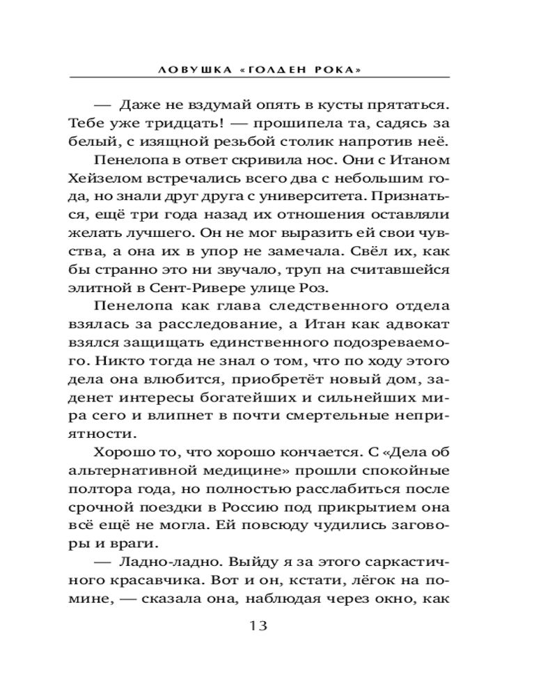 💳 Оплатить за товар можно при получении 🇰🇿 Есть бесплатная доставка по Казахстану от 1 дня 🎁 Копите бонусы с каждой покупки Серия: Добро пожаловать в Сент-Ривер. Романтические детективы Лии Виаты Долгожданный отпуск и медовый месяц на Мальдивах уже совсем близко, но внезапное правительственное задание путает все планы. Пенелопу и Итана вызывают на только открывшийся роскошный курорт «Голден Рок», чтобы они охраняли дочь президента. Задание превращается в кошмар наяву, когда бывший министр финансов устраивает настоящую «Страну Чудес» на выживание. Напарникам придется задействовать все свои силы и таланты, чтобы не стать одними из жертв убийцы, найти способ спасти людей и разгадать темные тайны гостей курорта. |