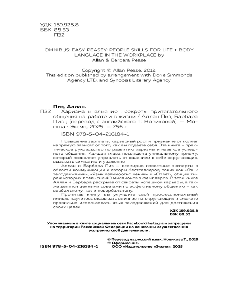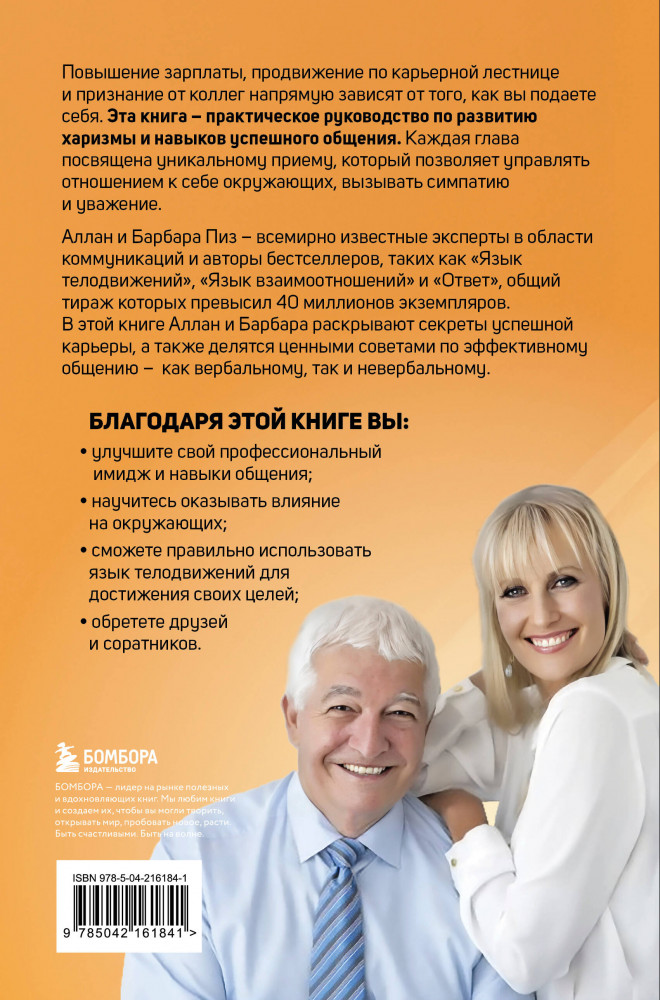 💳 Оплатить за товар можно при получении 🇰🇿 Есть бесплатная доставка по Казахстану от 1 дня 🎁 Копите бонусы с каждой покупки Серия: Психология общения. Новое оформление Повышение зарплаты, продвижение по карьерной лестнице и признание от коллег напрямую зависят от того, как вы подаете себя. Эта книга — практическое руководство по развитию харизмы и навыков успешного общения. Каждая глава посвящена уникальному приему, который позволяет управлять отношением к себе окружающих, вызывать симпатию и уважение. Аллан и Барбара Пиз — всемирно известные эксперты в области коммуникаций и авторы бестселлеров, таких как «Язык телодвижений», «Язык взаимоотношений» и «Ответ», общий тираж которых превысил 40 миллионов экземпляров. В этой книге Аллан и Барбара раскрывают секреты успешной карьеры, а также делятся ценными советами по эффективному общению — как вербальному, так и невербальному. |