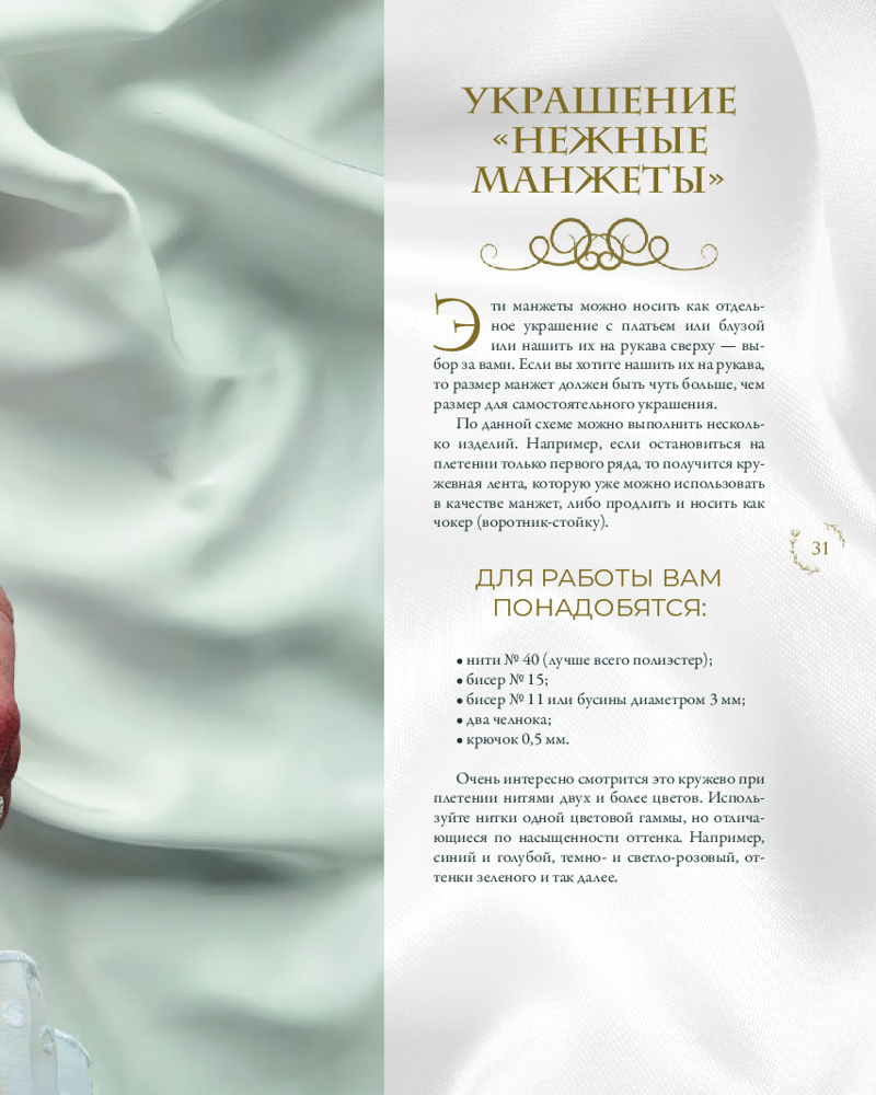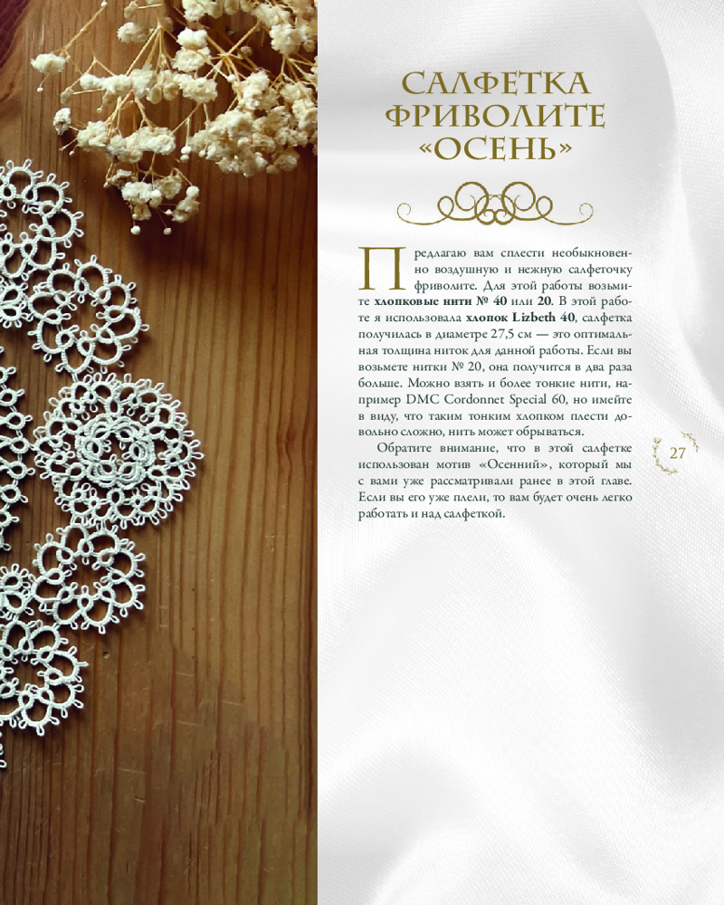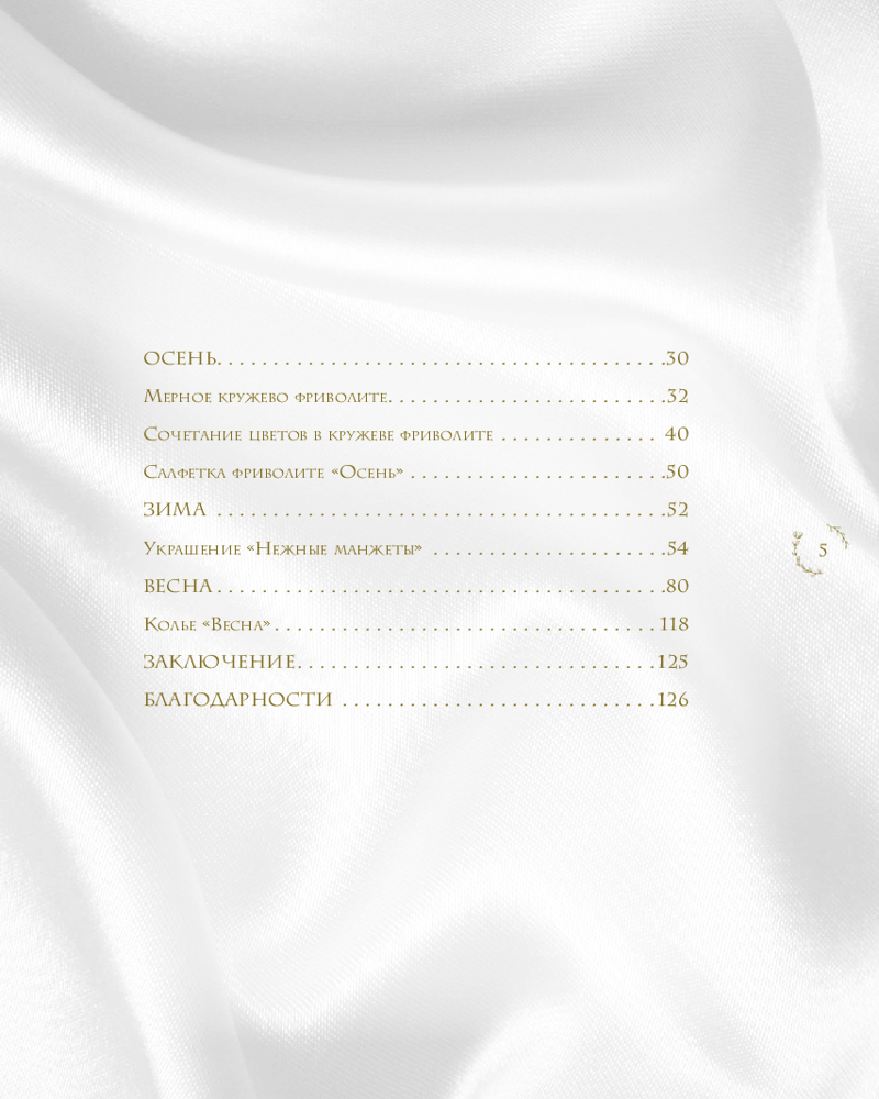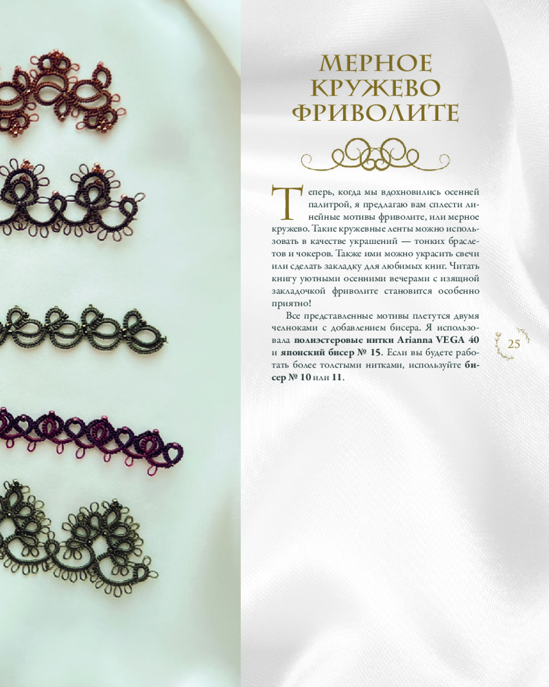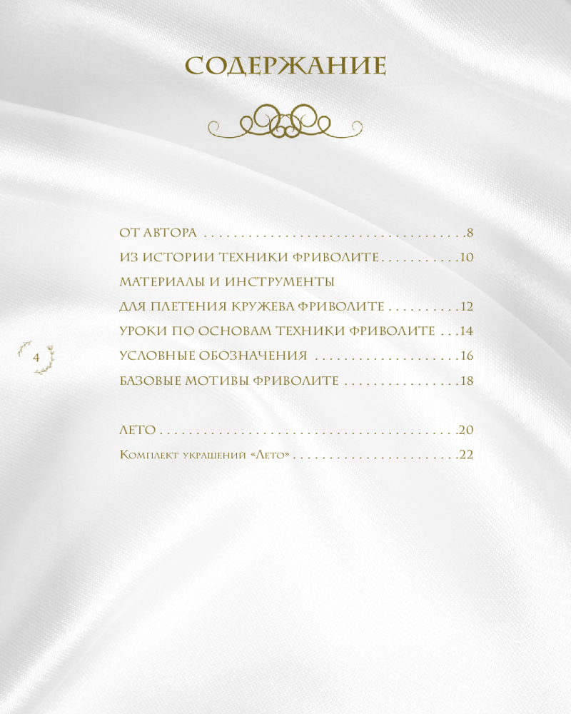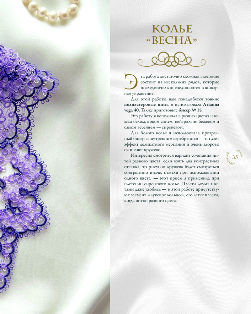 • 4 мастер-класса с пошаговыми описаниями и схемами по созданию изумительных украшений: комплект украшений «Лето», салфетка фриволите «Осень», нежные манжеты, колье «Весна»;