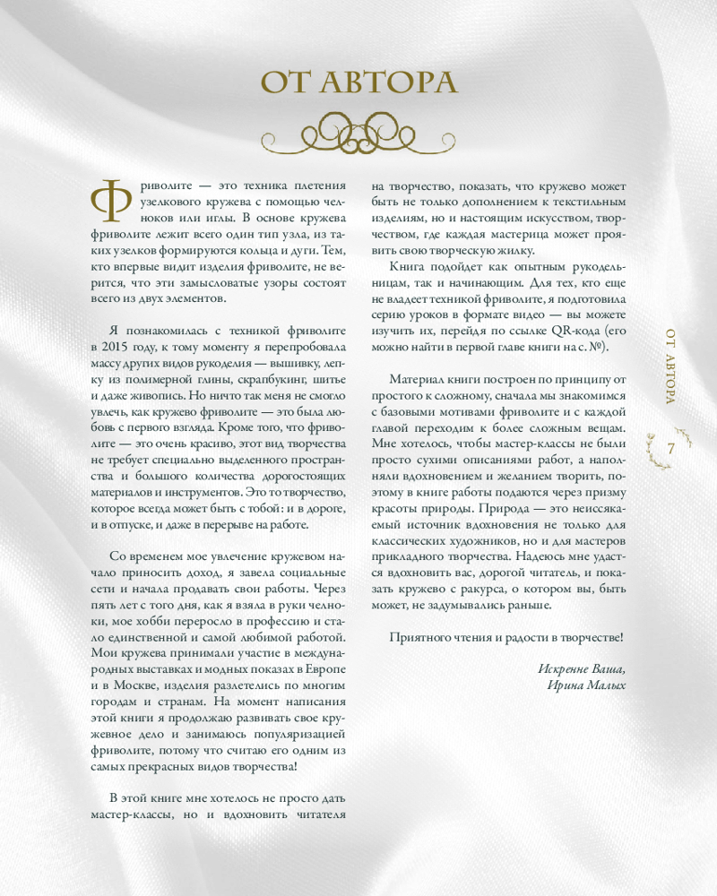 Ирина Малых — профессиональная кружевница, преподаватель, блогер, основатель студии Irina Malykh lace. Работы Ирины были показаны на неделях моды в Риме, Гааге, на выставке в Париже. Пусть эта книга подарит вам вдохновение на создание изделий, которые станут вашим личным произведением искусства! |