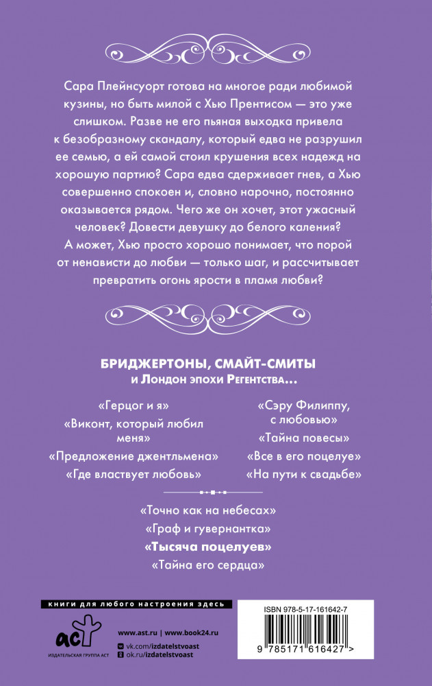 💳 Оплатить за товар можно при получении 🇰🇿 Есть бесплатная доставка по Казахстану от 1 дня 🎁 Копите бонусы с каждой покупки Серия: Бриджертоны и другие Сара Плейнсуорт готова на многое ради любимой кузины, но быть милой с Хью Прентисом — это уже слишком. Разве не его пьяная выходка привела к безобразному скандалу, который едва не разрушил ее семью, а ей самой стоил крушения всех надежд на хорошую партию? Сара едва сдерживает гнев, а Хью совершенно спокоен и, словно нарочно, постоянно оказывается рядом. Чего же он хочет, этот ужасный человек? Довести девушку до белого каления? А может, Хью просто хорошо понимает, что порой от ненависти до любви — только шаг, и рассчитывает превратить огонь ярости в пламя любви? |