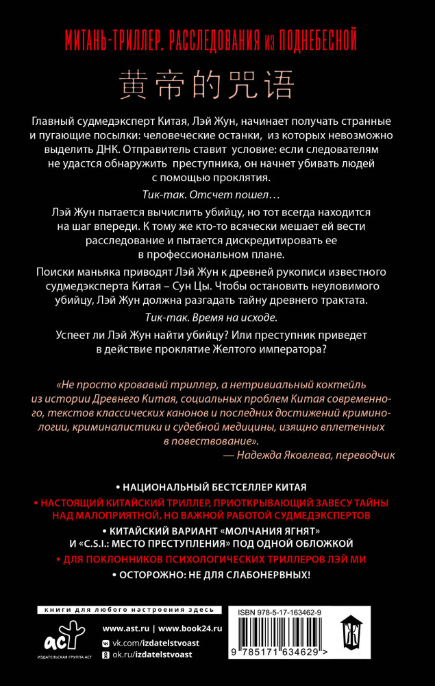 💳 Оплатить за товар можно при получении 🇰🇿 Есть бесплатная доставка по Казахстану от 1 дня 🎁 Копите бонусы с каждой покупки Серия: Митань-триллер. Расследования из Поднебесной Главный судмедэксперт Китая, Лэй Жун, начинает получать странные и пугающие посылки: человеческие останки, из которых невозможно выделить ДНК. Отправитель ставит условие: если следователям не удастся обнаружить преступника, он начнет убивать людей с помощью проклятия. Тик-так. Отсчет пошел... |