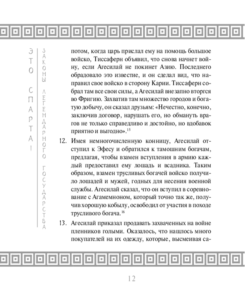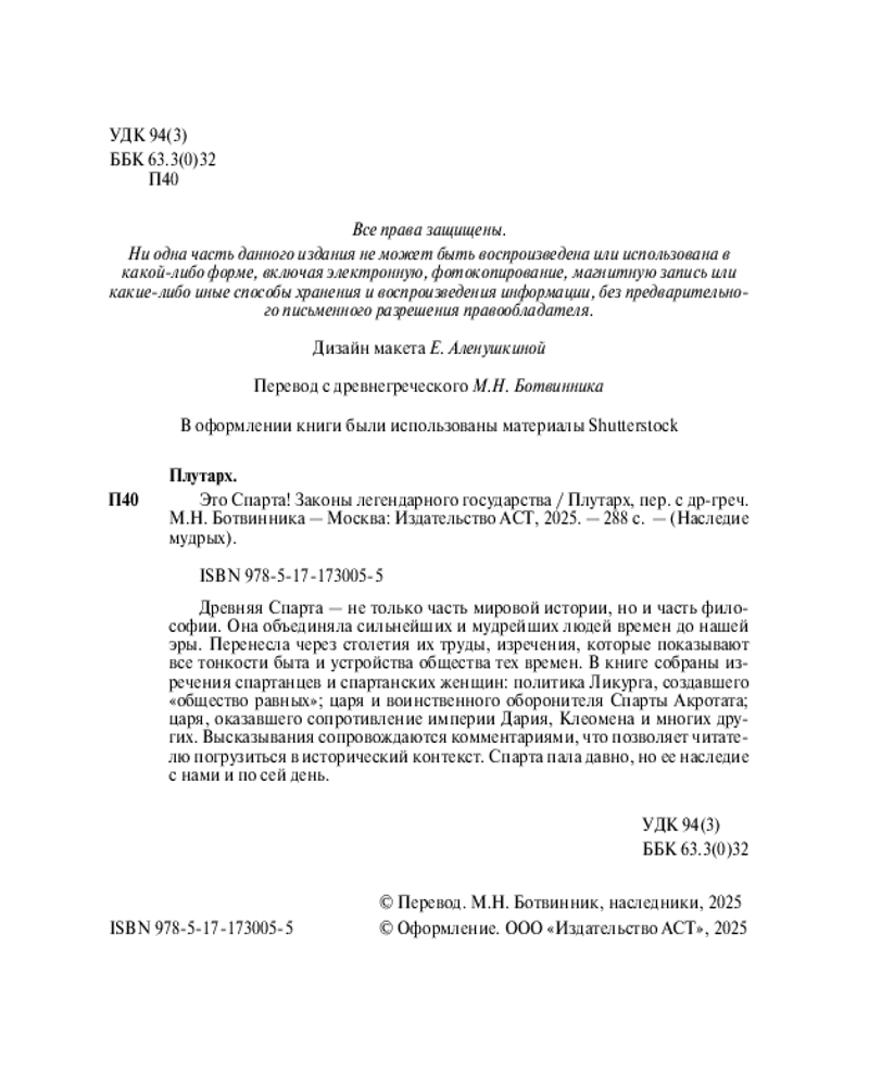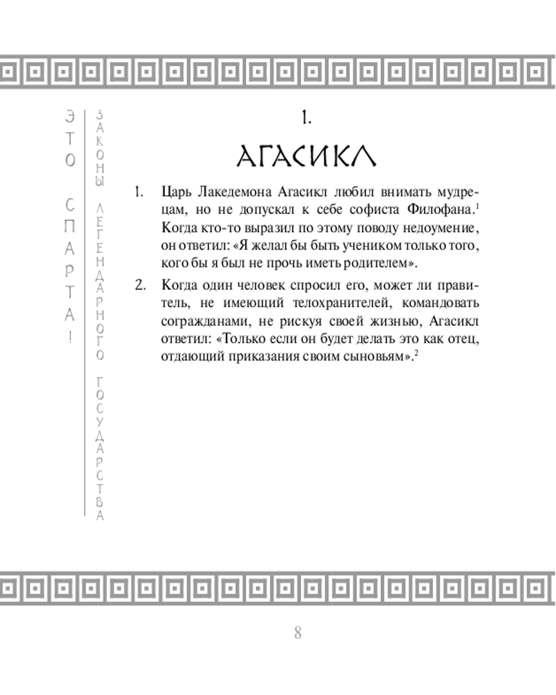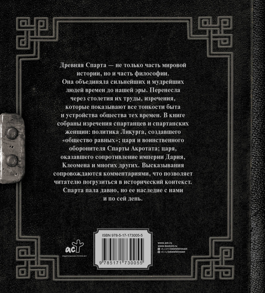 💳 Оплатить за товар можно при получении 🇰🇿 Есть бесплатная доставка по Казахстану от 1 дня 🎁 Копите бонусы с каждой покупки Серия: Наследие мудрых Древняя Спарта — не только часть мировой истории, но и часть философии. Она объединяла сильнейших и мудрейших людей времен до нашей эры. Перенесла через столетия их труды, изречения, которые показывают все тонкости быта и устройства общества тех времен. В книге собраны изречения спартанцев и спартанских женщин: политика Ликурга, создавшего «общество равных»; царя и воинственного оборонителя Спарты Акротата; царя, оказавшего сопротивление империи Дария, Клеомена и многих других. Высказывания сопровождаются комментариями, что позволяет читателю погрузиться в исторический контекст. Спарта пала давно, но ее наследие с нами и по сей день. |