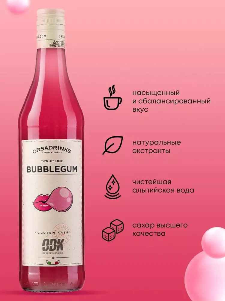 Вкус детства с тонким и ярким фруктовым ароматом нравится и взрослым и детям. Его любят за неповторимые вкусовые ноты и яркое сочетание фруктовых компонентов. Сироп для коктейлей «Баббл Гам» моментально переносит нас в чудесные детские годы. Фруктово-ягодный всплеск, приятная сладость и едва ощутимая кислинка наполняют напитки неповторимым букетом вкуса. Сочетание удивительное, оно радует и поднимает настроение, поэтому вкус жвачки так любят многие.