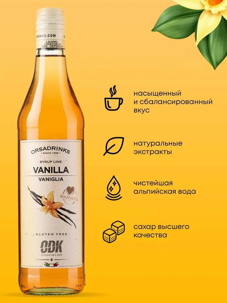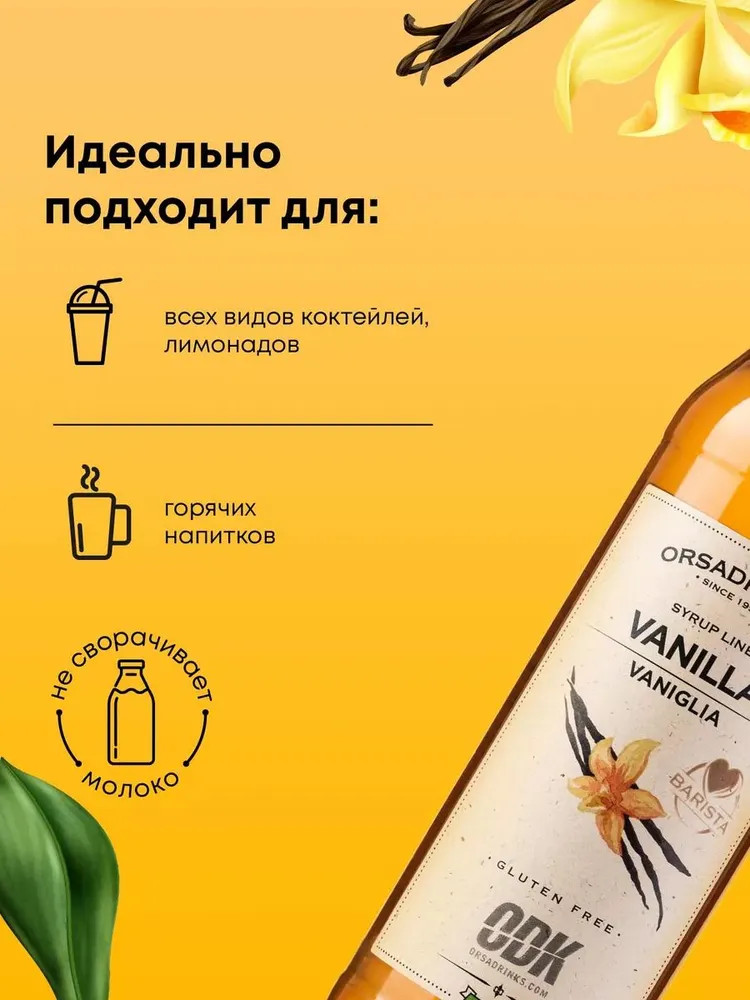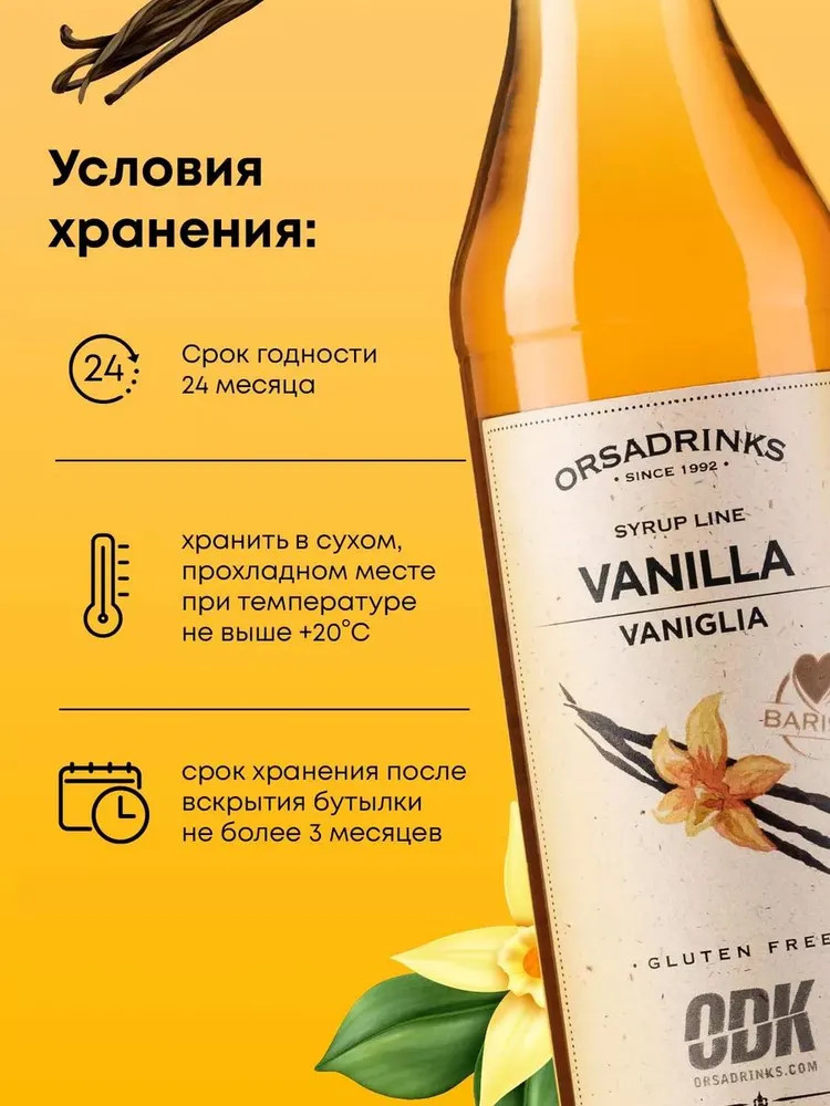 Мягкая ароматная ваниль — идеальная пряность, которая помогает раскрываться многим блюдам. Сироп для напитков с ванильным вкусом и потрясающим ароматом становится отличной альтернативой полюбившейся специи. «Ваниль» — вкусный сахарный сироп, который передает тонкие запахи известной специи. Мягкий и нежный вкус, небольшая горечь, которая оставляет приятное послевкусие, немного терпкие нотки — все это приносит максимум удовольствия при дегустации продуктов. Добавьте сюда сладость — и вы получите идеальный сироп для коктейлей с ванильным вкусом.