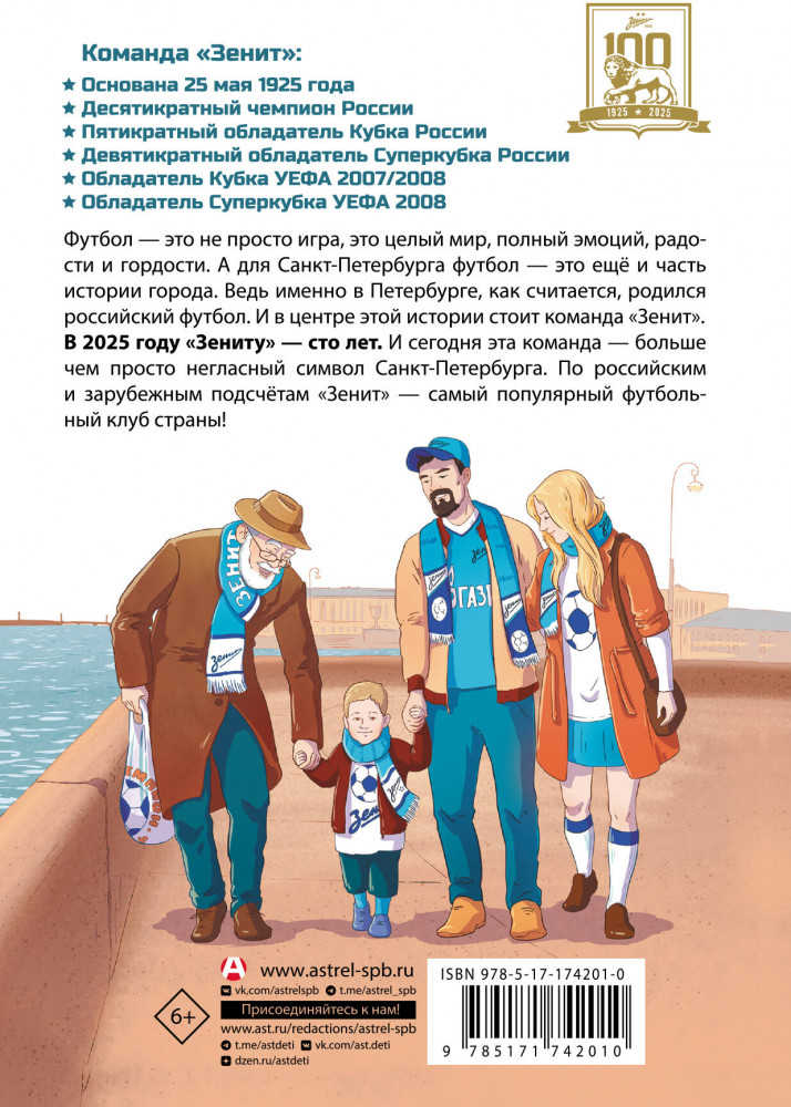 💳 Оплатить за товар можно при получении 🇰🇿 Есть бесплатная доставка по Казахстану от 1 дня 🎁 Копите бонусы с каждой покупки Серия: Звёзды отечественного спорта для детей Футбол — это не просто игра, это целый мир, полный эмоций, радости и гордости. А для Санкт-Петербурга футбол — это ещё и часть истории города. Ведь именно в Петербурге, как считается, родился российский футбол. И в центре этой истории стоит команда «Зенит». В 2025 году «Зениту» — сто лет. И сегодня эта команда — больше чем просто негласный символ Санкт-Петербурга. По российским и зарубежным подсчётам «Зенит» — самый популярный футбольный клуб страны! |