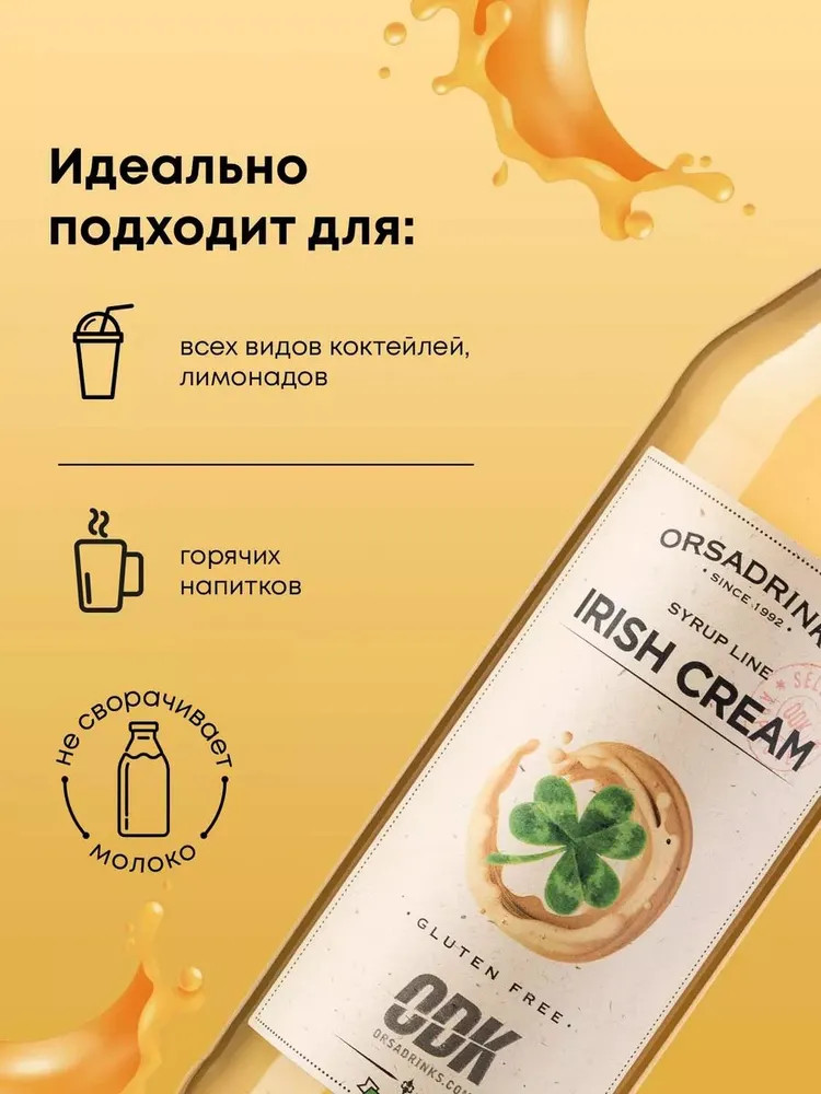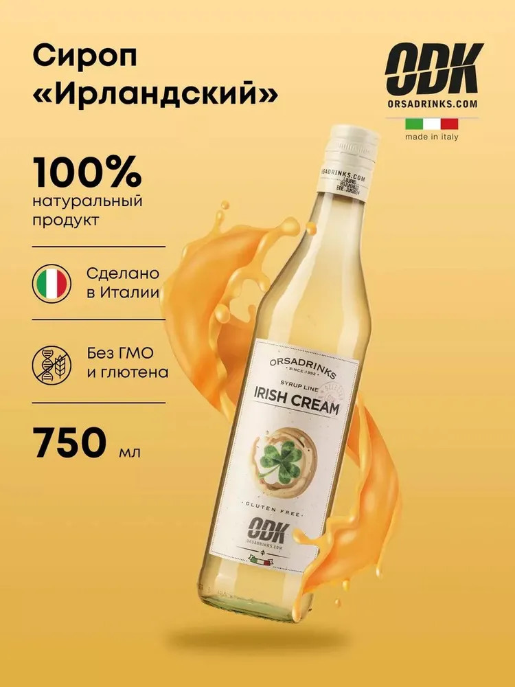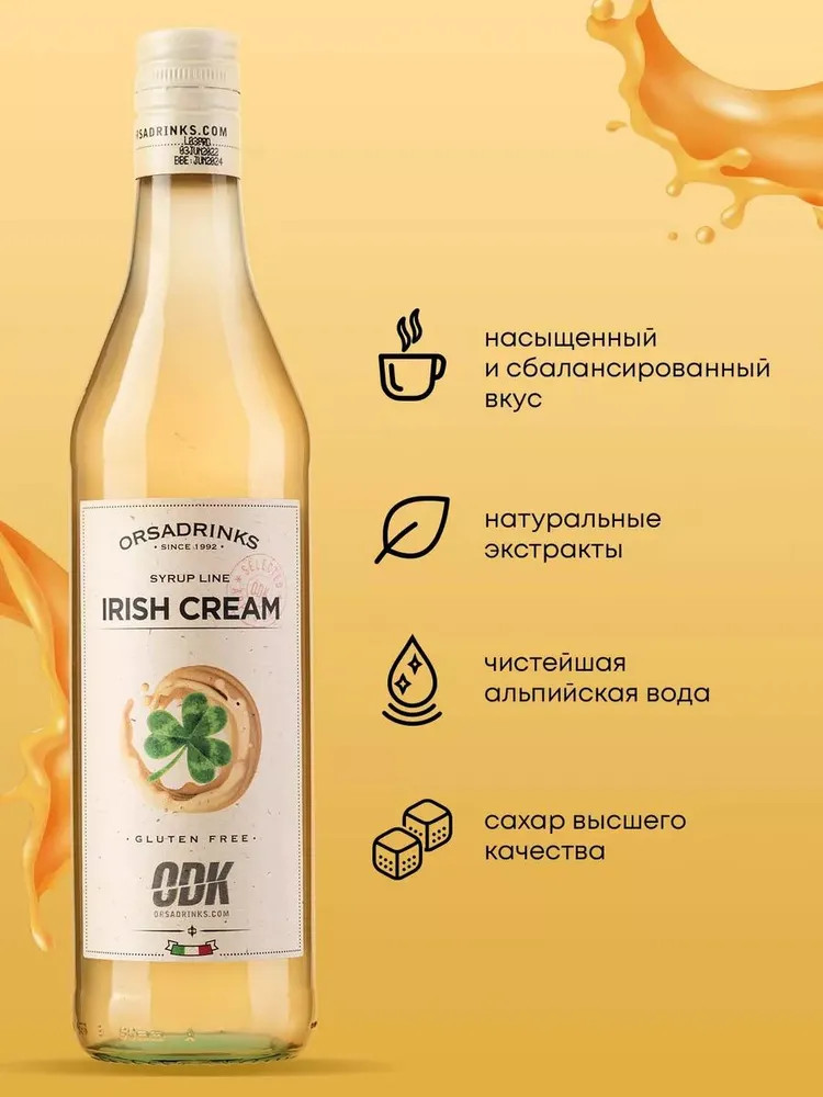 Оригинальный вкус сиропа для напитков «Ирландский» особенно любим ценителями ярких кофейно-сливочных нот и пряностей. Сироп для коктейлей «Ирландский» — это традиционное сочетание кофе, сливок с нотами сладкой карамели. Немного горечи ирландского виски придает этому ингредиенту неповторимый вкус и приятный пряный аромат.