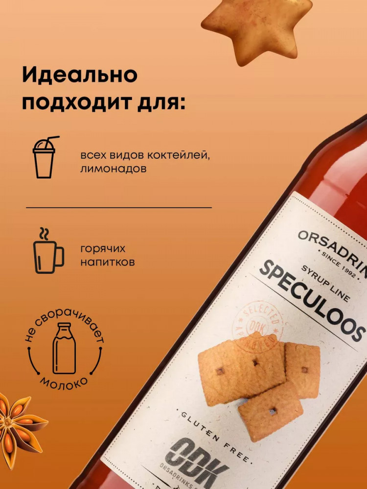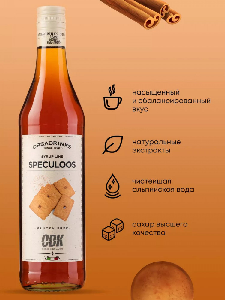 Пряный, мягкий и необычайно вкусный сироп для напитков «Печенье Спекулос» сразу отметили гурманы во всем мире. Сейчас с ним готовят всевозможные коктейли, используют в кулинарии, чтобы радовать гостей приятным вкусом одноименной выпечки. Спекулос — это имбирное печенье с карамельными нотами, именно такой вкус имеет сироп для коктейлей «Печенье Спекулос». В нем отчетливо ощущаются ноты корицы, гвоздики и кардамона. Это букет специй переносит нас в зимние вечера, когда вся семья собирается за праздничным столом.