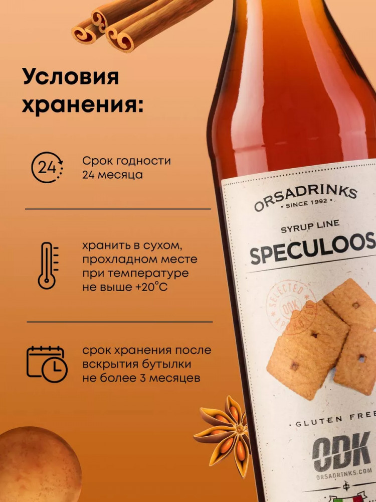 Применение: пряный вкус сахарного сиропа «Печенье Спекулос» актуален для безалкогольных и алкогольных напитков, особенно коктейлей на основе крепкого спиртного. Они согревают, поднимают настроение. Уместно использовать его как сироп для лимонадов, если хочется придать напитку необычный привкус. Идеально раскрываются ароматы пряностей в кофе и чае, так что как сироп для кофе или сироп для чая он подходит идеально. Будет одновременно ароматной добавкой и заменителем сахара. Другие варианты применения: сироп для десертов, например для пропитки торта или для выпечки; сироп для мороженного; ингредиент для смузи. Любые эксперименты создают новые удивительные рецепты с неповторимым вкусом ароматного праздничного печенья. Не сворачивается в горячем молоке.