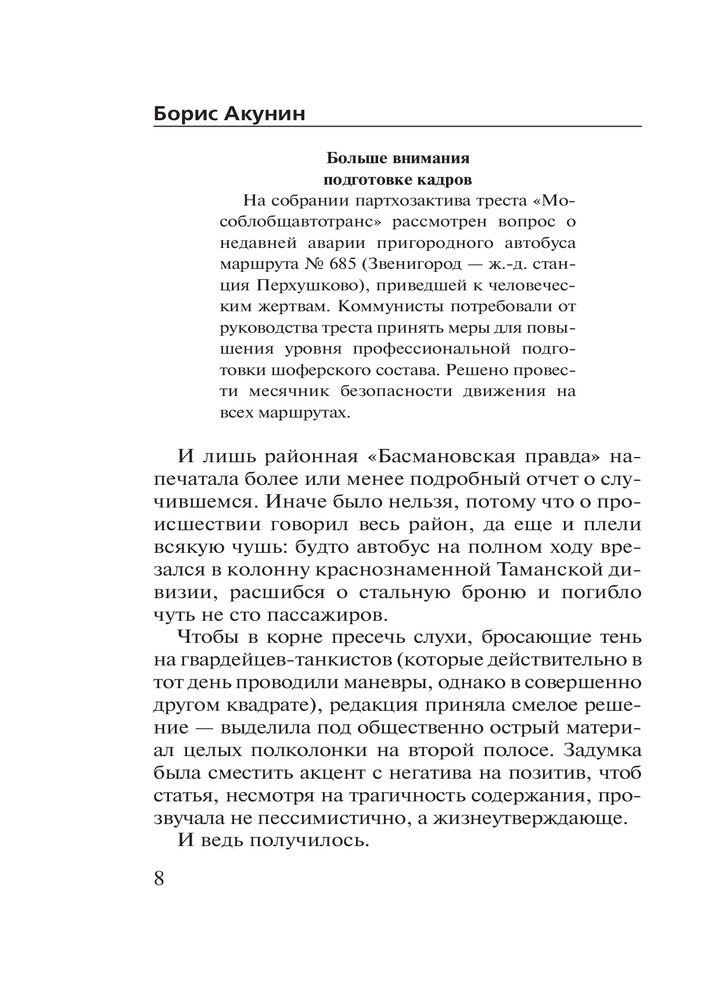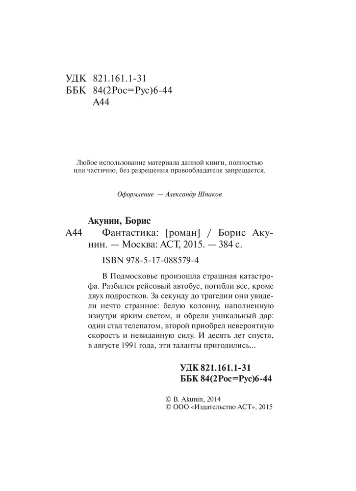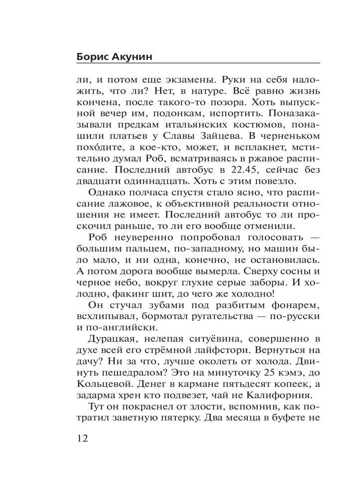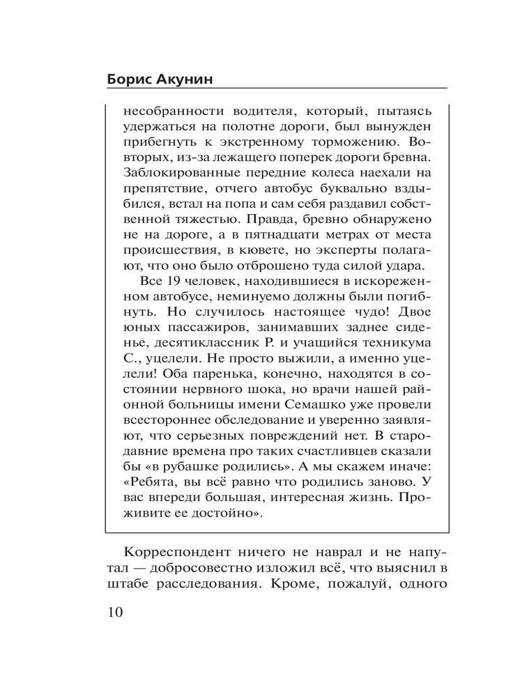 Люблю Бориса Акунина за его стиль и жанры. Практически перечитала все его работы. Стараюсь не упускать ни одну из его новинок. Вот и нашлось время почитать то, что откладывалось в долгий ящик. Планы на новогодние и рождественские праздники были - насладиться долгожданным чтением качественных (на мой скромный взгляд) книг. Прочитать, прочитала, НО такого от Акунина не ожидала. Книга изобилует многочисленными терминами, сленгами, фактами. Трактования произошедшего события и дальнейшие додумки каждого персонажа только привносят бессмысленности в сюжет. Ощущение от прочтенного, словно автор решил попробовать себя в жанре фэнтези (или попробовать что-то в жанре Стивена Кинга), но этот «блин вышел комом». Акунин был бы не Акуниным, если бы не затронул исторические события и кое-какие факты. И тем не менее, в процессе чтения прямо-таки чувствуется какая-то обида. Как если бы автор пытался изложить, что все могло сложиться иначе, вмешайся персонажи вовремя.... В итоге от прочтенного в голове сумбур, хаос и бардак, разрозненные персонажи, непонятный сюжет. Не ожидала такого от любимого автора, если честно. Пожалуй пойду перечитаю про приключения Фандорина.